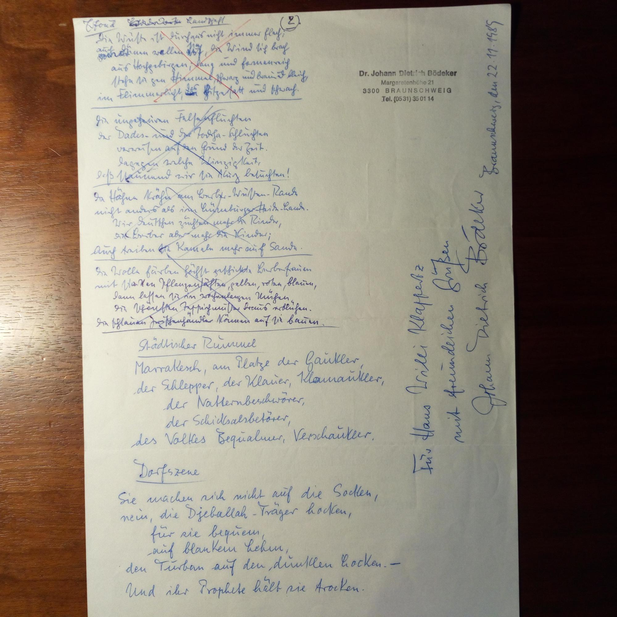 1918-2021, Schriftsteller - 2 8°-Blätter und 4°-Blatt mit e. Arbeitsnotizen zu Gedichten. E. ergänzt mit 2 weiteren Gedichten ("Städtischer Rummel" und "Dorfszene"), Widm. und U., Braunschweig 22.11.1989, Abs.stempel, Mit e. postal. Umschlag.