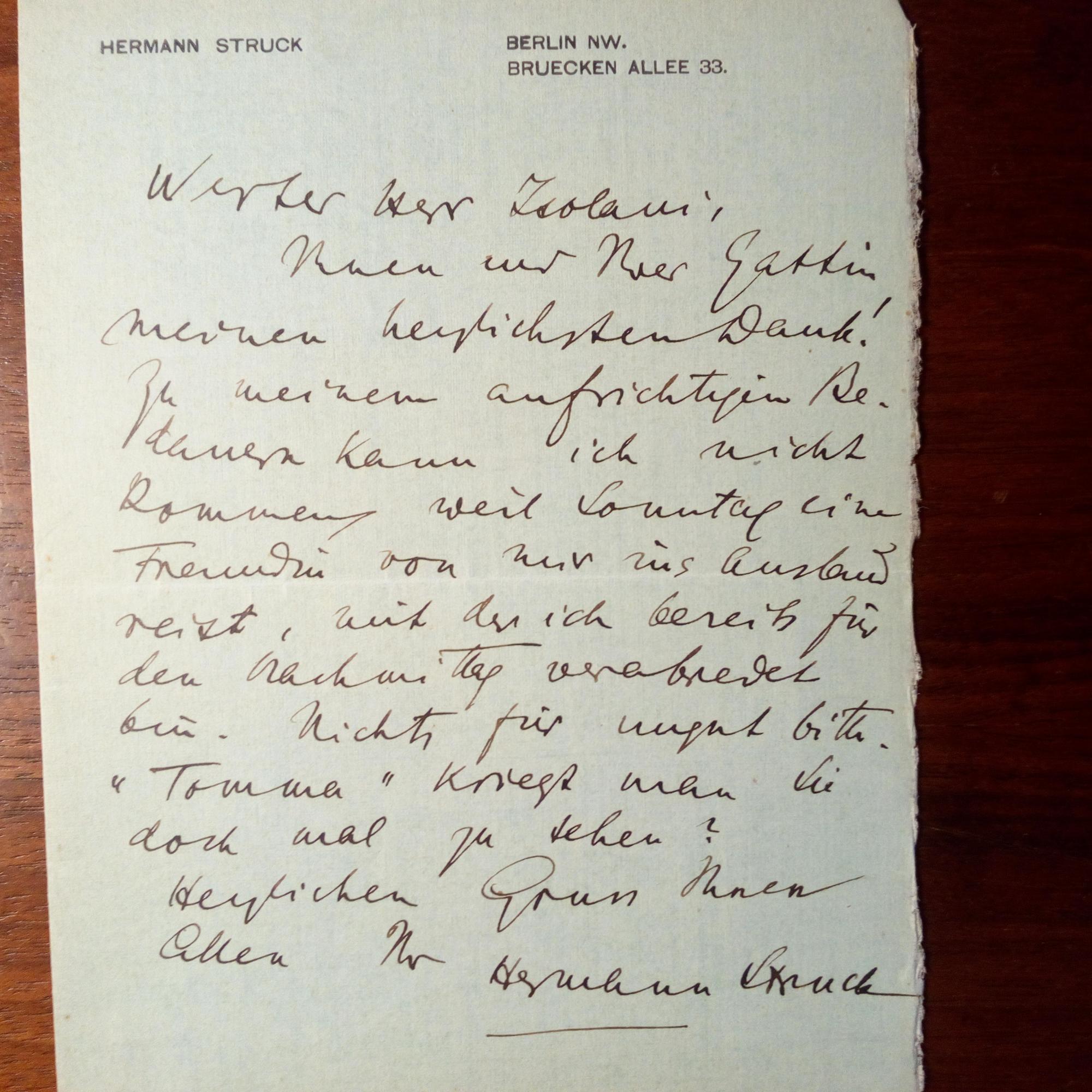 1876-1944, dt.-jüd. Maler und Graphiker, Zionist (übersiedelte 1923 nach Palästina) - E. Brief mit U., Berlin o. D., 1 S. 8°. An den Schriftsteller und Theaterkritiker Eugen Isolani (1860-1932) in Berlin: Muss einer Einladung absagen und: ..."Tomma" kriegt man sie doch mal zu sehen?... (wohl dessen Th.A.-Edison-Biographie, ersch. 1905).