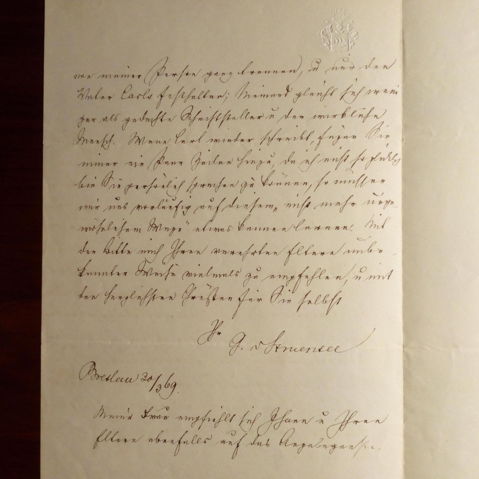 Pseudonym G. vom See, 1803-75, Schrift-steller - E. Br. m. U., Breslau 30.3.1869, 2 S. 8°, sauber geschr., gepr. Wappen am Kopf, e. Anschrift. Stellt sich der Verlobten seines Sohnes Carl, Frl. Else von Kräwel vor: ...die Photographie ist eine schöne Erfindung, aber der lebende Mensch sieht doch immer anders aus, als der photographierte...