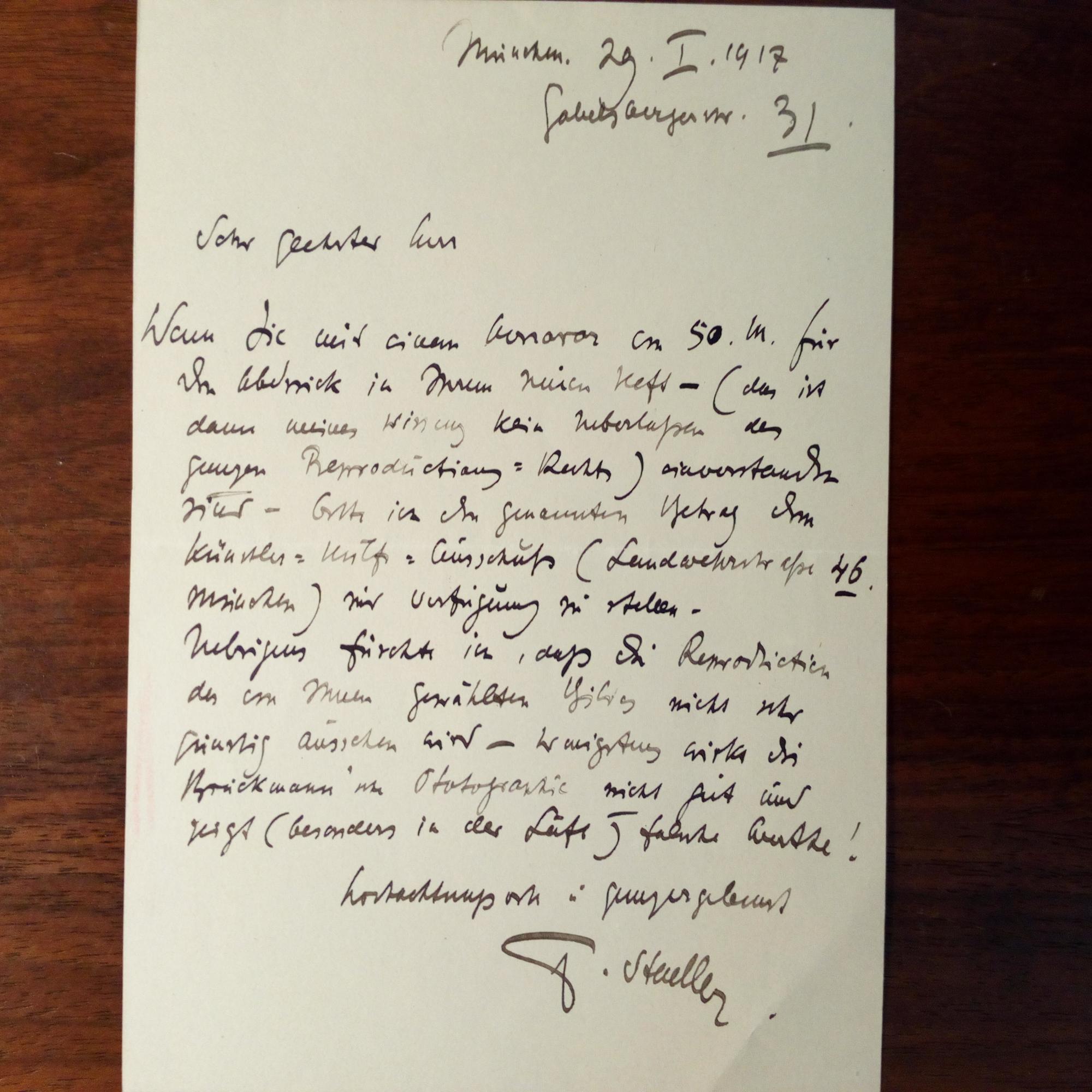 1889-1967, Graphiker (bes. Exlibris) - E. Brief mit U., München 29.1.1917, 1 S. 8°, kl. Schrift. Sein Honorar solle dem "Künstler-Hilfs-Ausschuss" zur Verfügung gestellt werden und: ...wirkt die Bruckmann in Photographie nicht gut und zeigt (besonders in der Luft) falsche Watte...