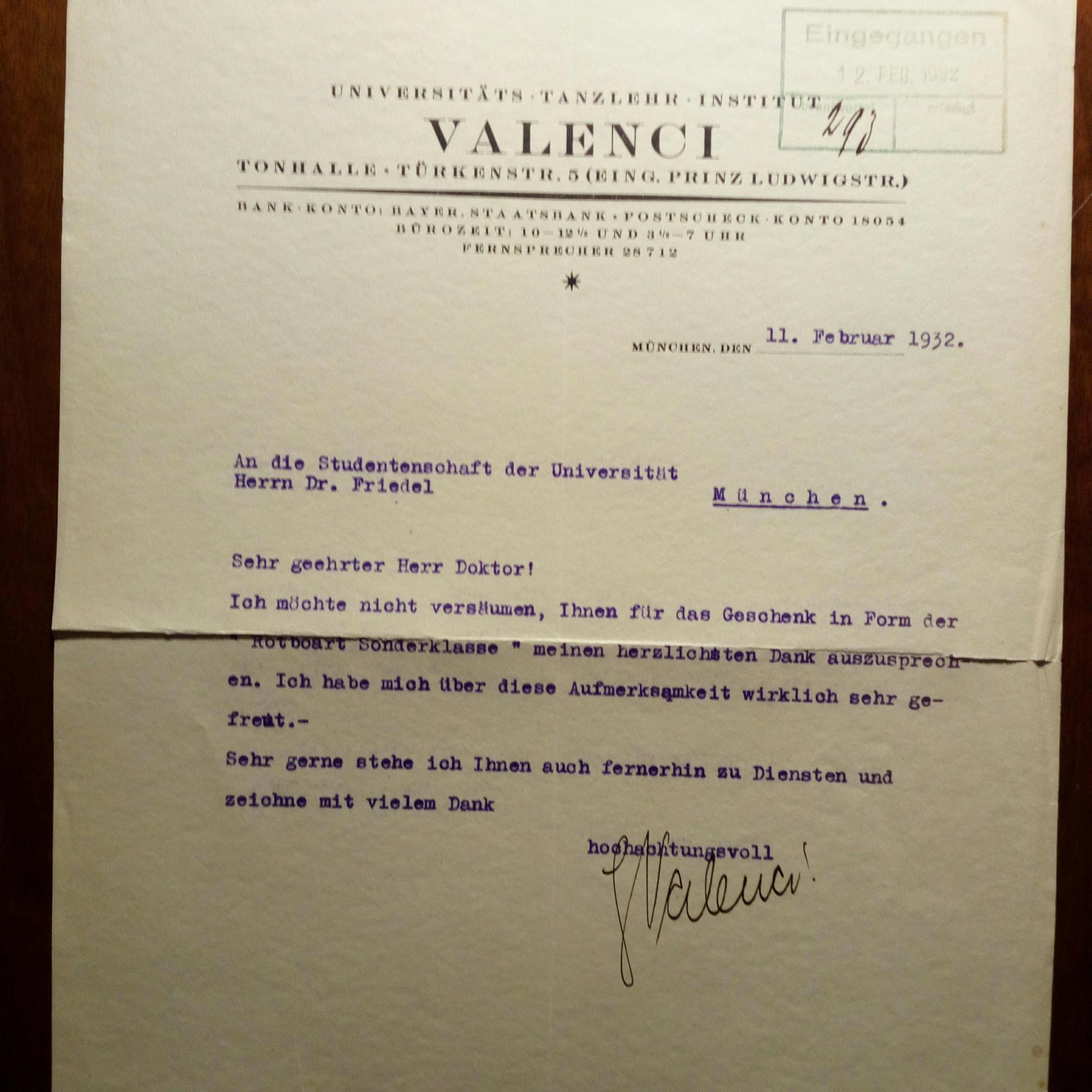 1892-1977, akadem. Tanzlehrer - Brief mit U., (München) 11.2.1932, ¾ S. 4°, Br.kopf seines "Universitäts-Tanzlehrer-Insituts" in der Tonhalle, Eing.stempel. Dankt der Studentenschaft und Herrn Dr. Friedel "für das Geschenk in Form der 'Rotbart-Sonderklasse'".