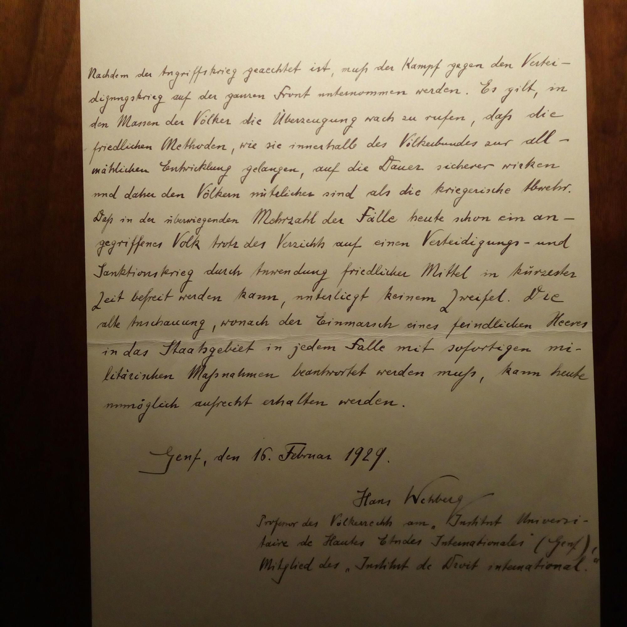 1885-1962, Völkerrechtler und Pazifist, hier als Prof. am "Institut Universaire des Hautes Etudes Internationales" in Genf - E. langes Zitat mit U., Genf 16.2.1929, 1 S. 4°. Zum Thema "Verteidigungskrieg". ...Die alte Anschauung, wonach der Einmarsch eines feindlichen Heeres in das Staatsgebiet in jedem Falle mit sofortigen militärischen Maßnahmen beantwortet werden muß, kann heute unmöglich aufrecht erhalten werden...