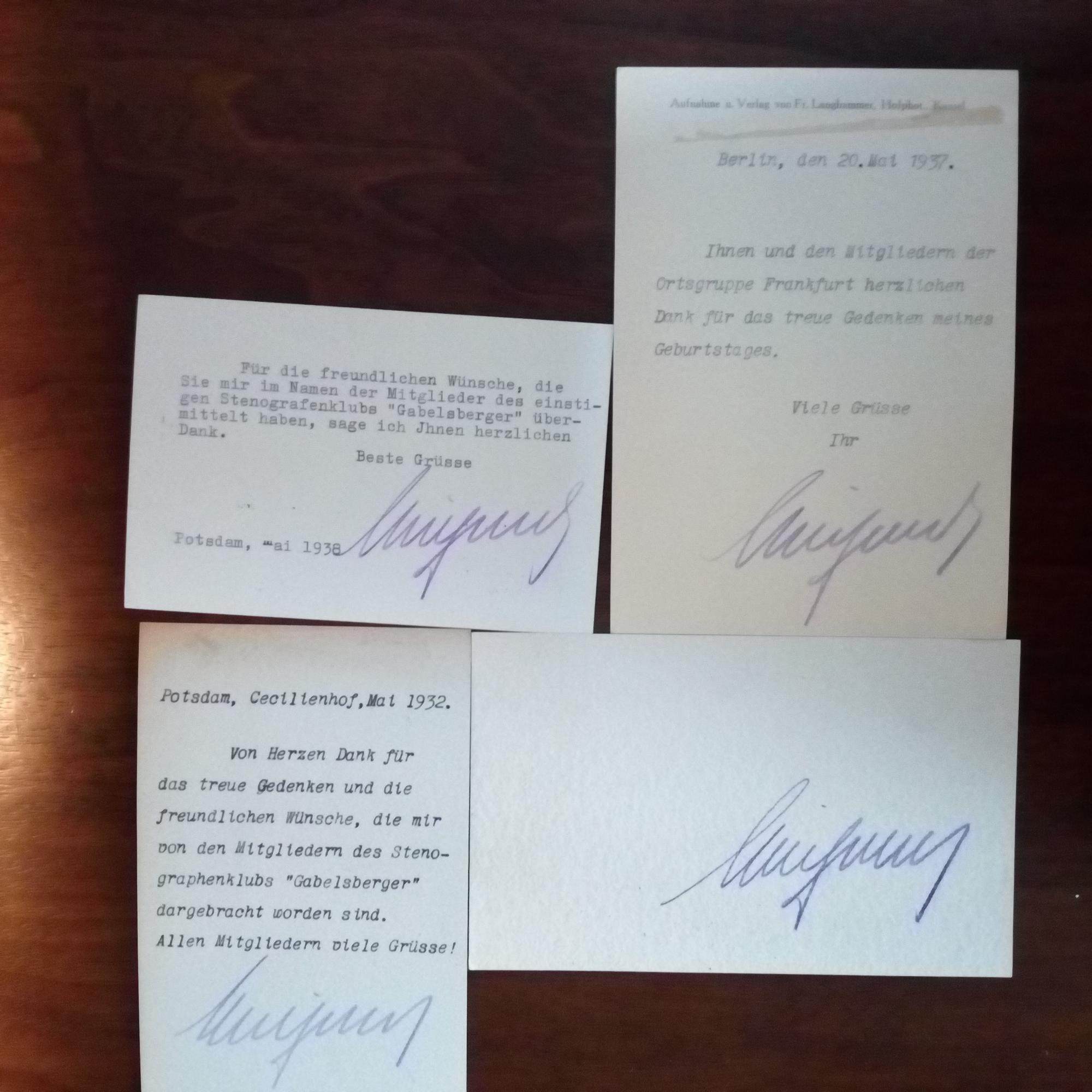 1882-1951, Kronprinz - Foto (zus. mit seiner Gattin Cecilie, geb. Prinzessin zu Mecklenburg, und Kaiser Wilhelm II.) als Ansichtskarte mit U. (Tintenstift), Potsdam Mai 1938. Dankt Mitgliedern des "einstigen Stenographenklubs 'Gabelsberger'" für Geb.wünsche. Beiliegt Pfo. mit ähnl. Rückseite (1937) und U. und 4 weitere kl. Beilagen, davon 2 mit U.