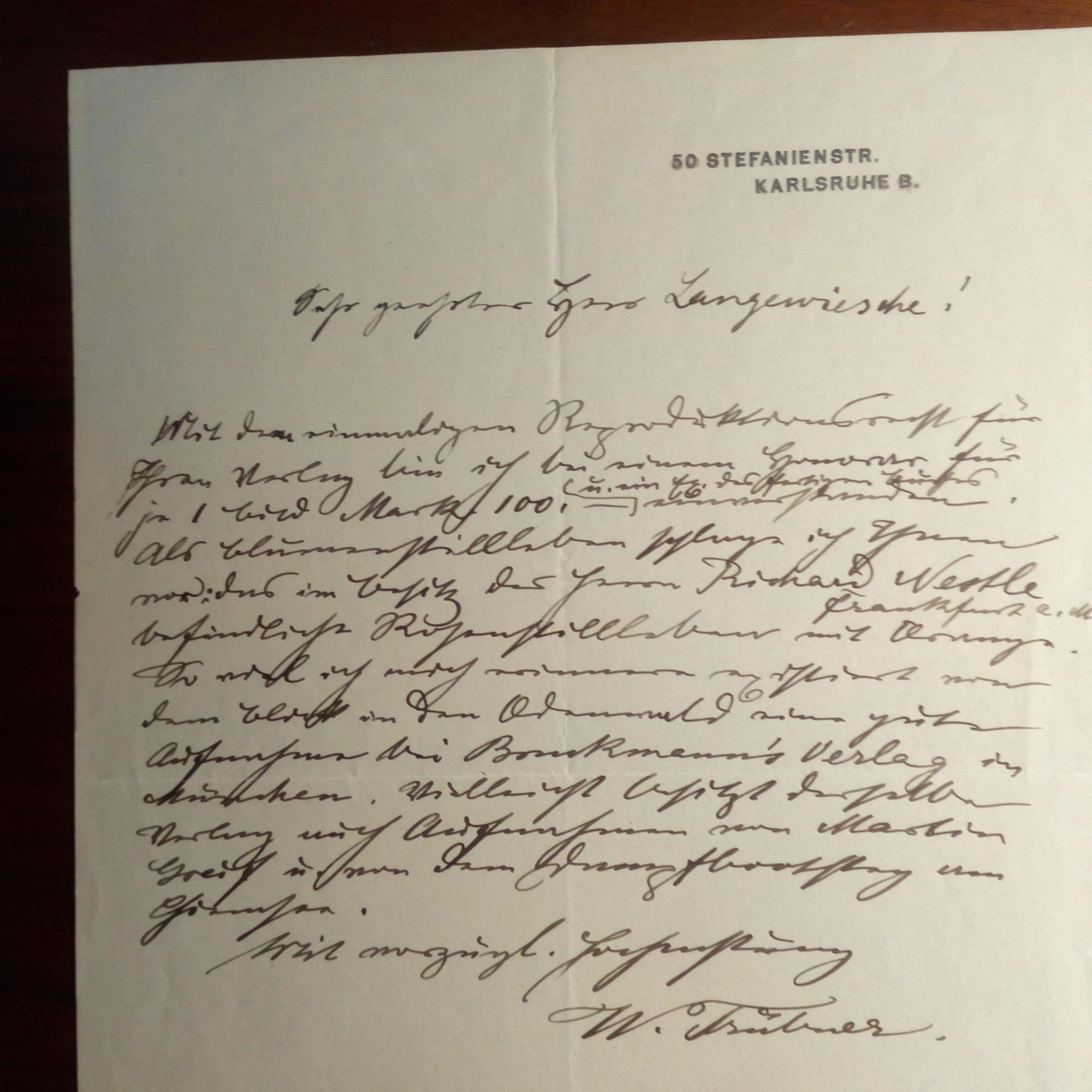 1851-1917, Maler - E. Br. m. U., ¾ S. 4°, Adressbr.kopf (Karlsruhe). Gibt dem Verleger Karl Robert Langewiesche (1877-1949) in Königstein (Taunus) Hinweise auf Abbildungen seiner Werke. ...Vielleicht besitzt derselbe Verlag auch Aufnahmen von Martin Greif...