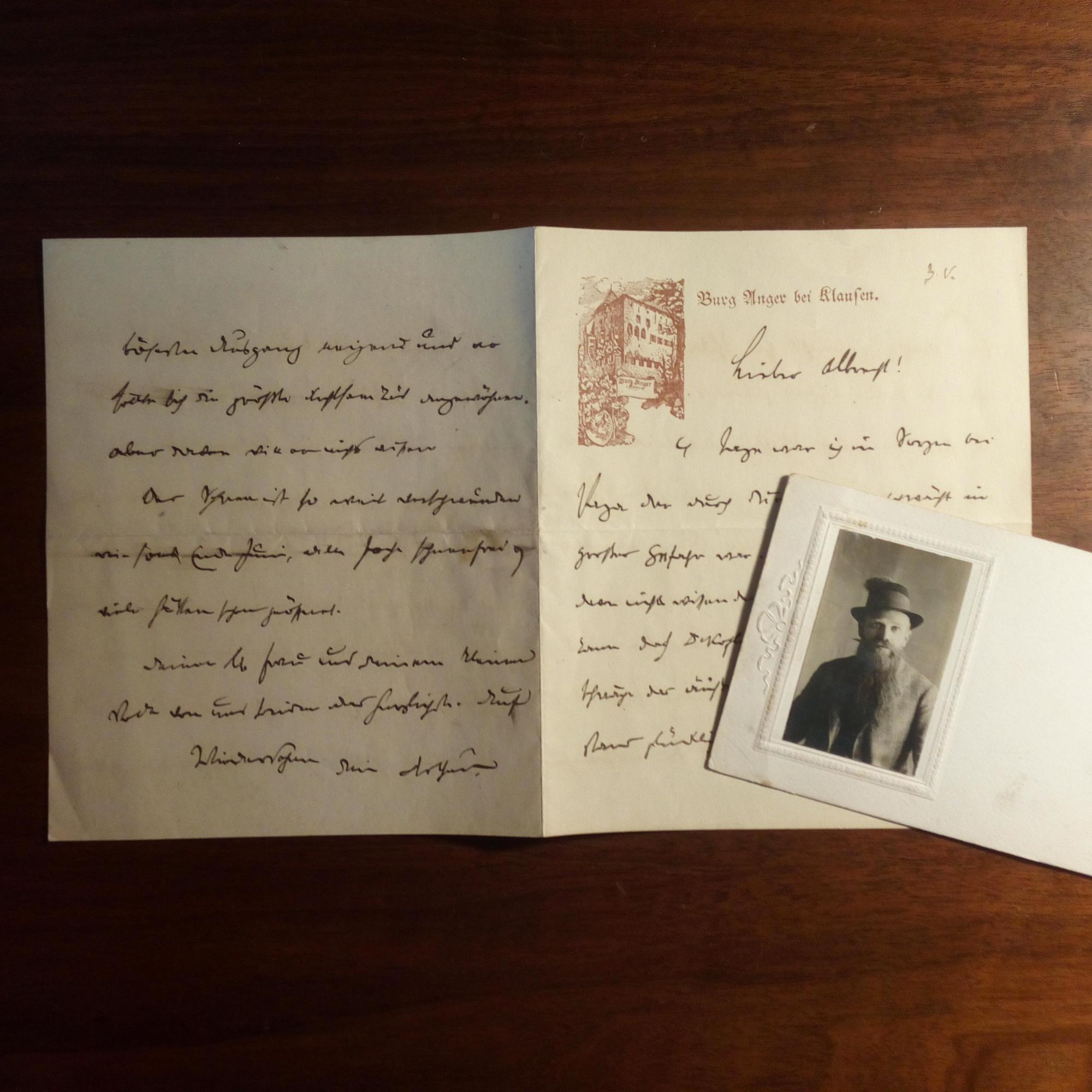 1866-1946, südtiroler Dichter - E. Br. m. U., 4 S. 8°, am Kopf Bild des Familienbesitzes Burg Anger (bei Klausen). Persönliches. Beiliegen 2 e. postal. Postkarten, Pfo. sowie eine postal. Postkarte m. vielen U. (auch seiner). Alles an den Historiker und Sprachforscher Albrecht Wirth (1866-1936) bzw. dessen Gattin Freya in Tittmoning (bei München). Alles m. kl. Altersspuren.