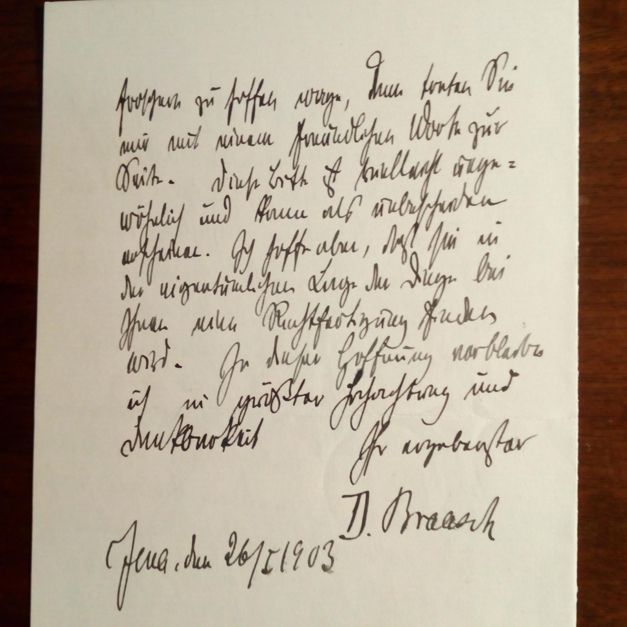 1846-1917, Theologe, Antidarwinist - E. Br. mit U., Jena 26.1.1903, 3 ¾ S. 8°. Dankt für Zusendung von "Studien" u. bittet, sein "Der Wahrheitsgehalt des Darwinismus" zu besprechen.
