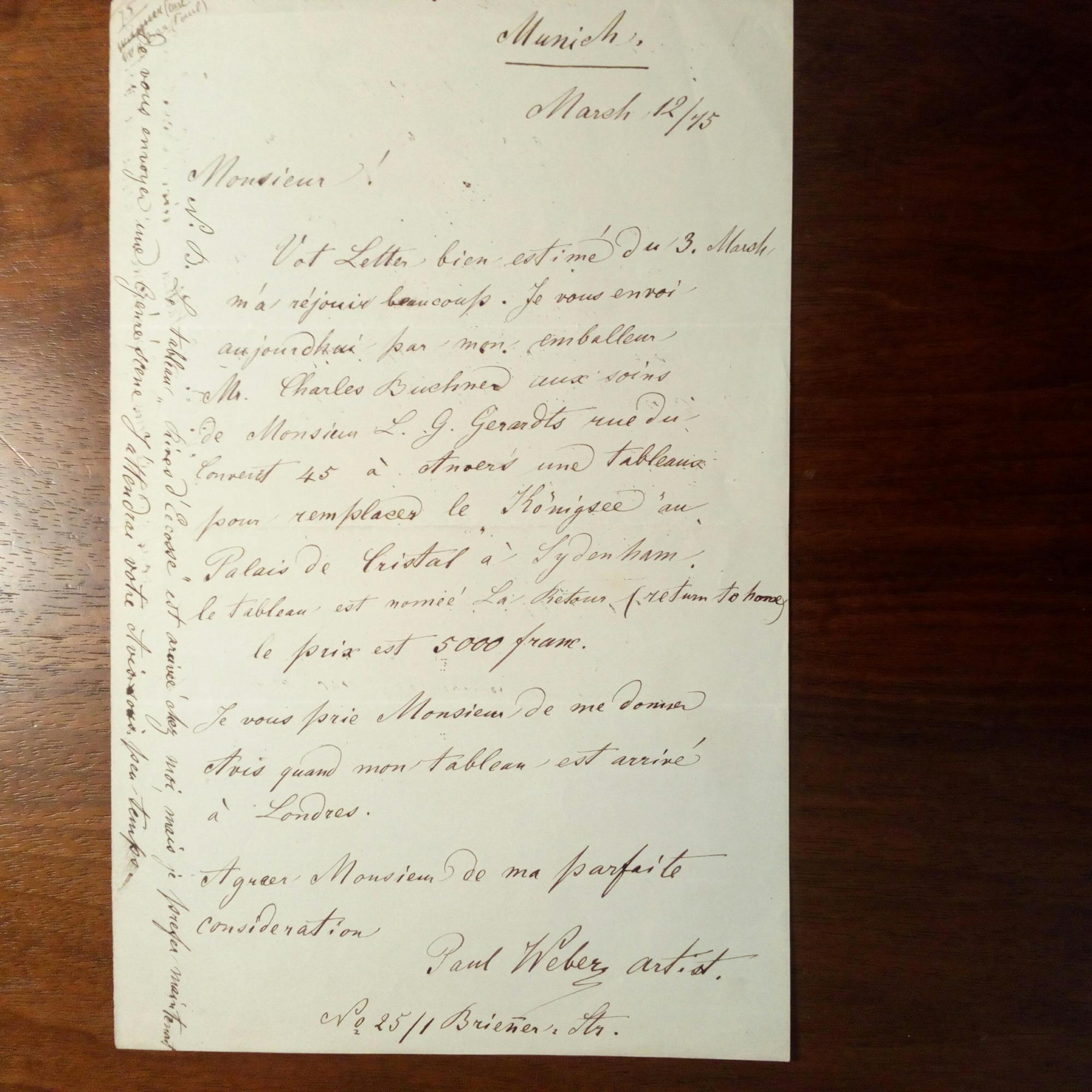 1823-1916, Maler - E. Br. m. U., München 12.3.1875, 1 S. gr.8°, etw. tintenfleckig. Frz. an einen Galeristen betr. Verschickungen verschiedener seiner "tableaux", u.a. "remplacer le "Königsee" au "Palais de Crystal" à Sydenham (in London) ... le prix est 5000 franc...".
