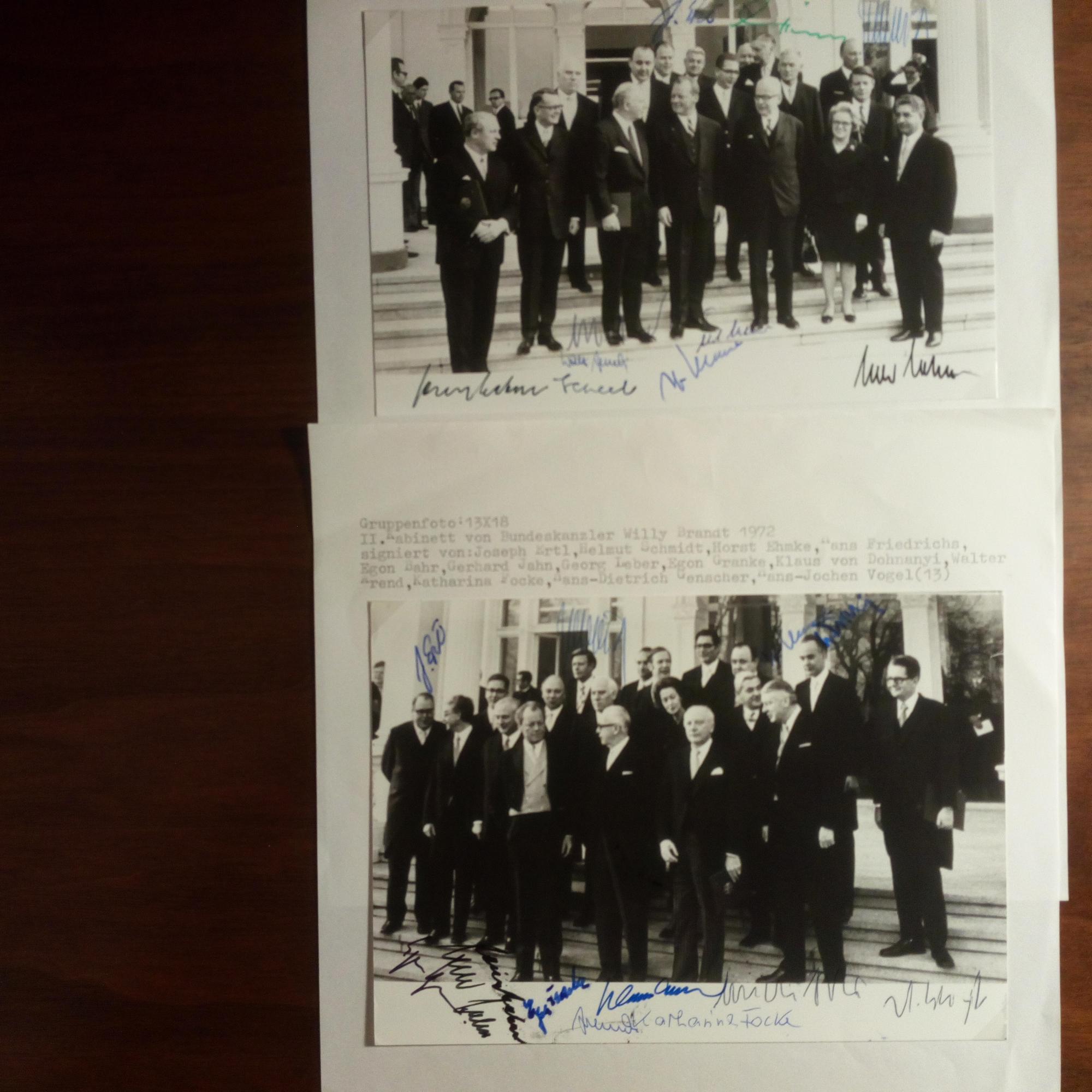 Bundeskanzler - Je Gruppenfoto seiner ersten beiden Kabinette (je ca. 8°quer) m. zus. 23 U. der Minister: Ertl, Schmidt, Genscher, Vogel, Scheel, Leber, Arendt, Focke, Eppler, Jahn...