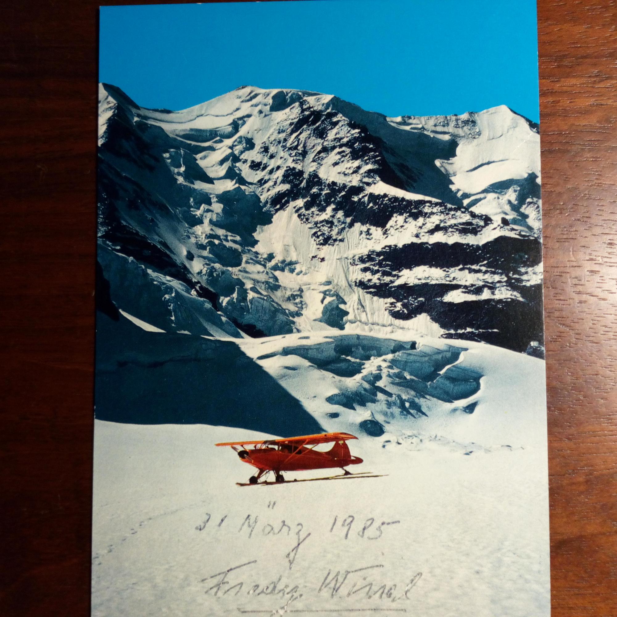 1903-94, schweiz. Gletscher- und Rettungsflieger - Ansichtskarte (sein Flugzeug nach der Landung auf dem Gletscher des Piz Balü) mit U. und D. 31.3.1985 (minimal beschäd.). Auf Textseite kurze e. Mitt. und U. , mit e. postal. Umschlag (St. Moritz, U. im Abs.).