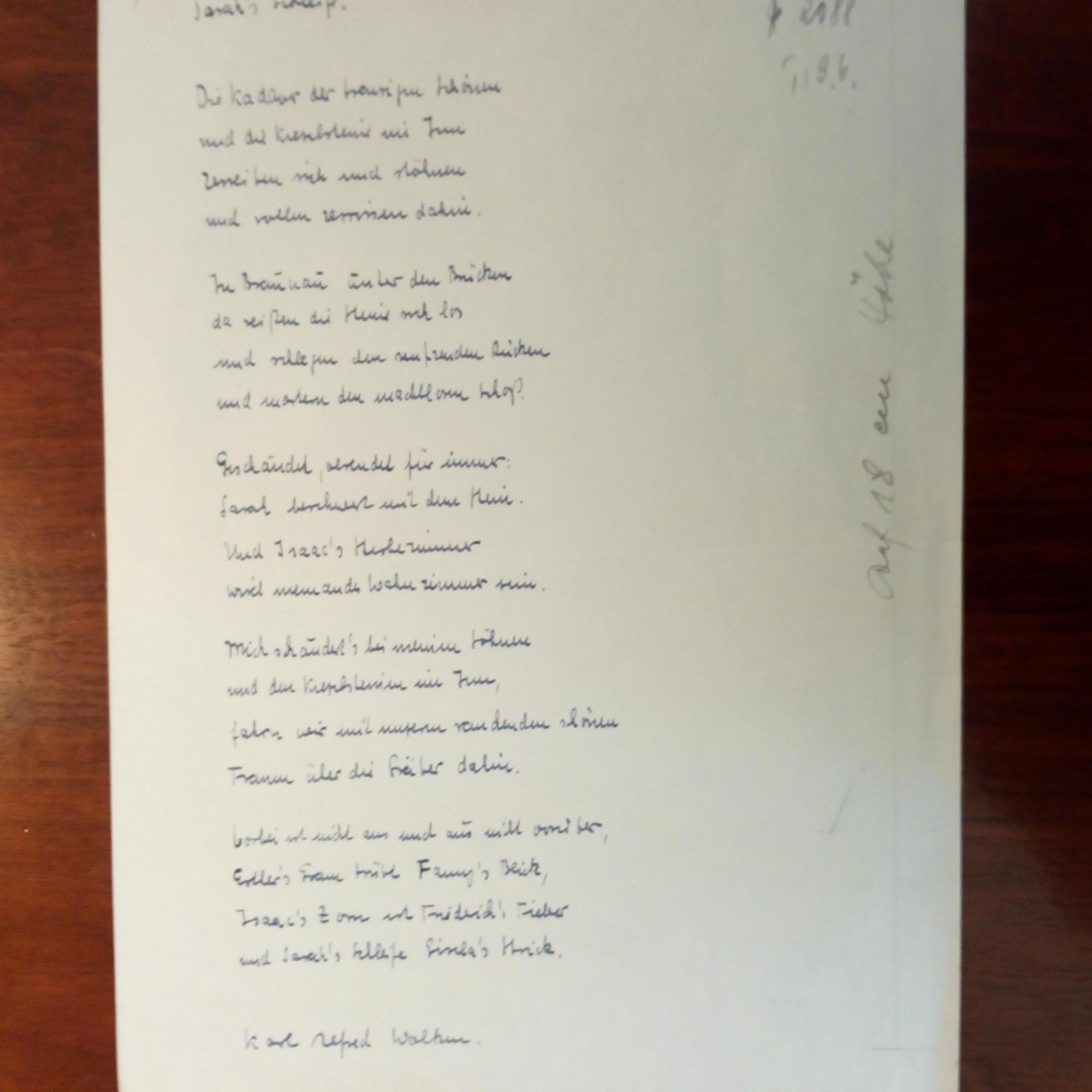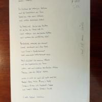 1929-2020, Schriftsteller - 2 4°-Blätter, je mit e. schön geschr. Gedicht und U. "Wassers Schlaf" (4 Str. à 4 Z.) und "Sarah's Schleife" (5 Str. à 4 Z.), letzteres mit Druck-Angaben von and. Hand.