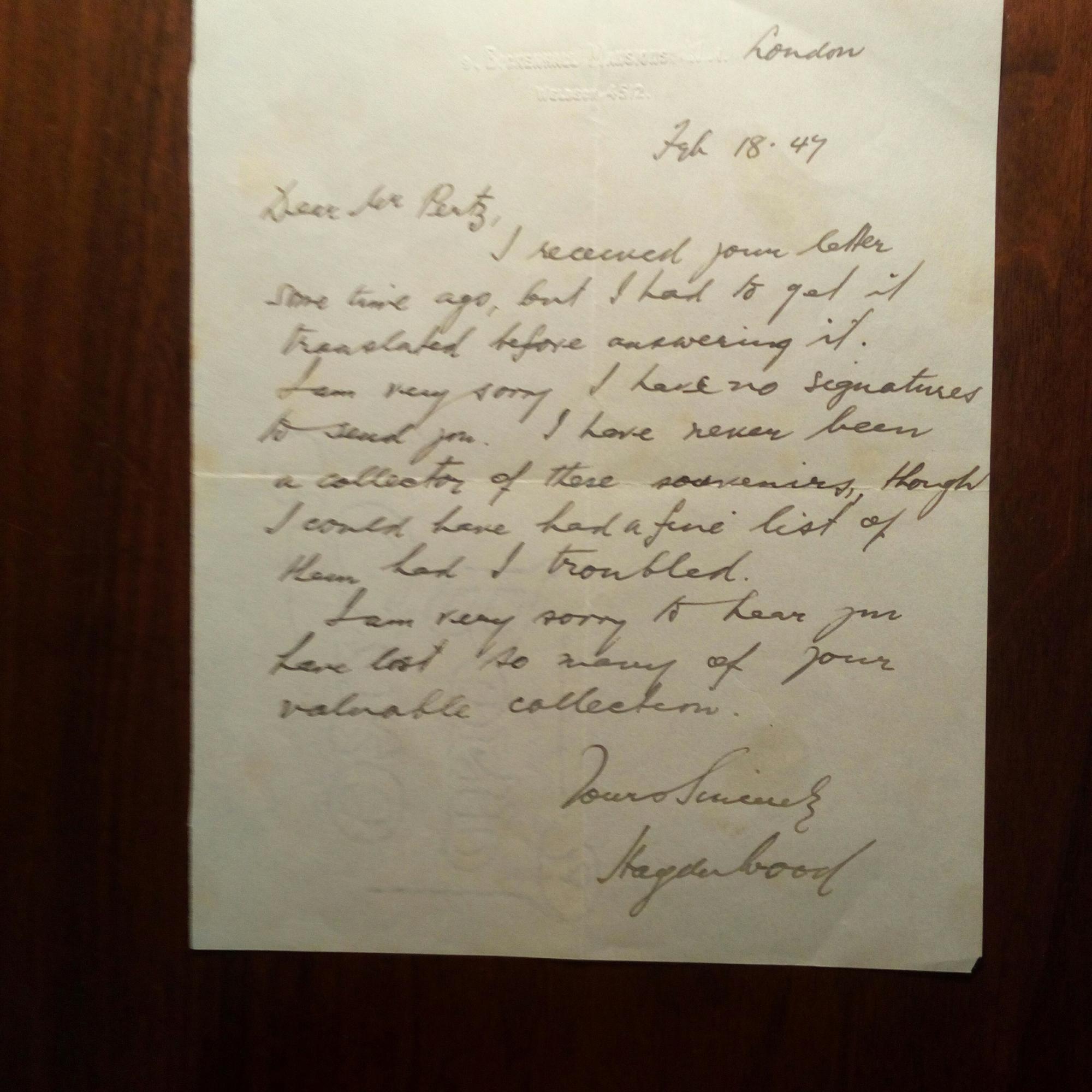 1882-1959, brit. Violonist u. Komponist - E. Br. mit U., (London) 18.2.1947, 1 S. kl. 4°, gepr. Adressbr.kopf, mit e. postal. Umschl. (U. im Abs.). An einen Sammler in "Kidinghoven (Rhine Province)".