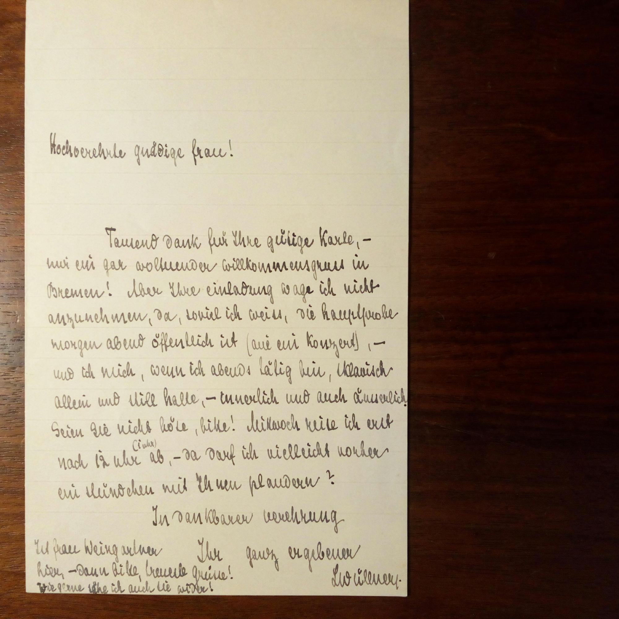 1858-1938, Tenor und Schauspieler, Sohn des Komponisten Franz W. - E. Br. m. U., 1 S. kl.8°, kl. Schrift. An eine Dame: Sagt einer Einladung ab, da er sich nach dem morgigen Konzert "alleine und still" halten müsse. Will sie aber am Mittwoch abholen und "nachher ein Stündchen mit Ihnen plaudern...". Erkundigt sich nach Frau Weingartner.