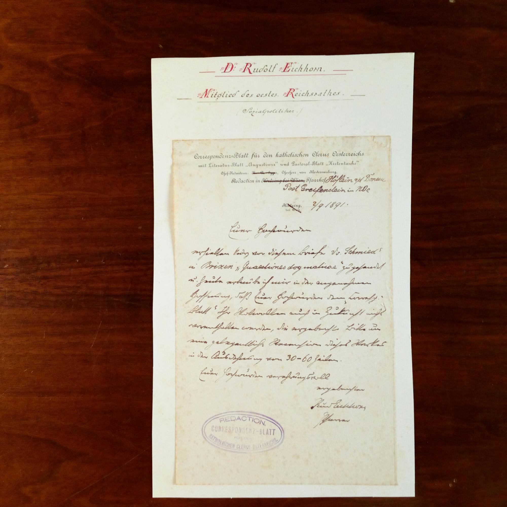 1853-1905, österr. Theologe u. Sozialpolitiker - E. Br. m. U., 1 S. gr. 8°, Br.kopf u. Stempel seines "Korrespondenz-Blattes für den katholischen Clerus Österreichs", Höflein a.d. Donau 2.9.1891, mont., gering stockfleckig. Bittet einen Kollegen, die "Quaestiones Dogmaticae" von Schmied (Brixen) in "30-60 Zeilen" zu rezensieren.