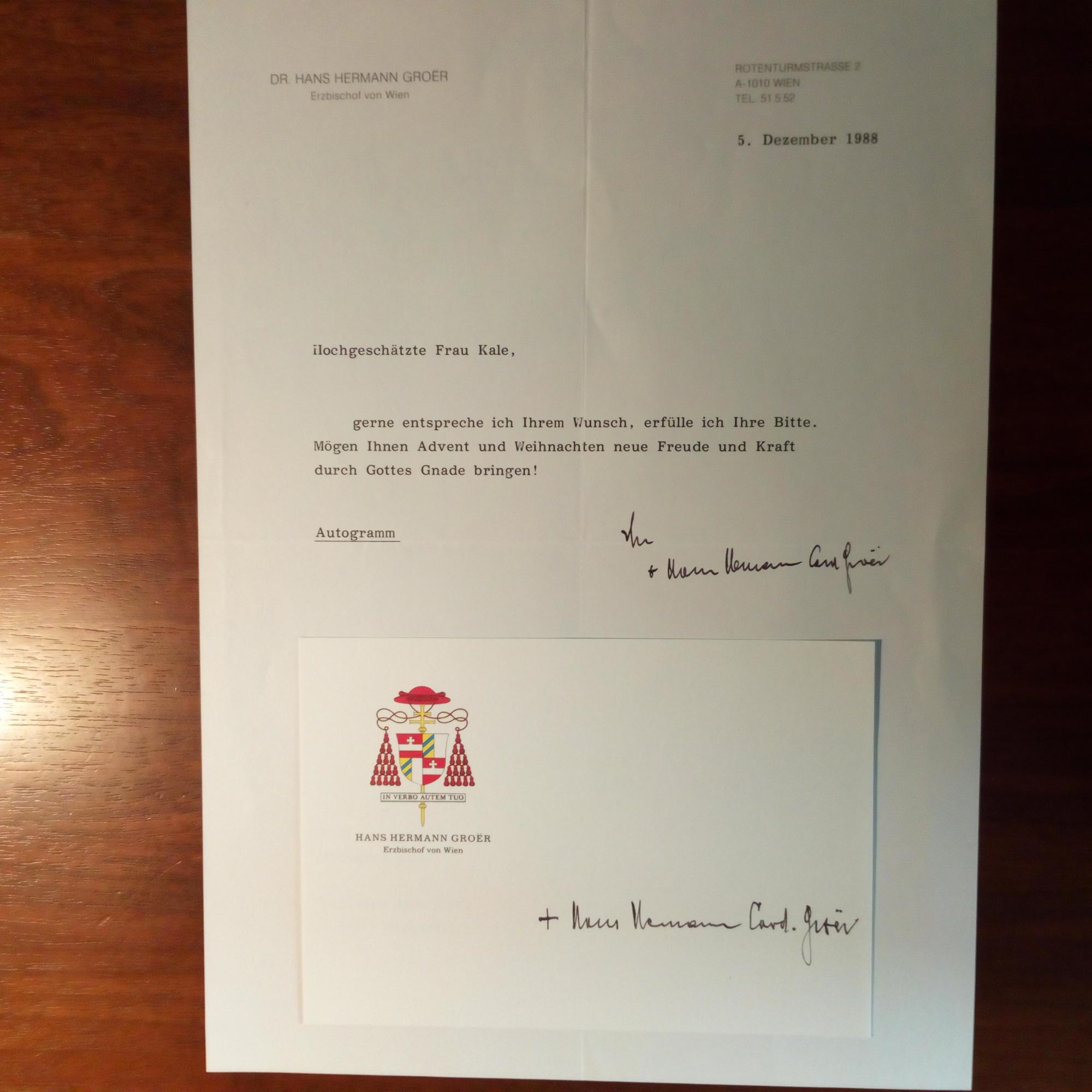 1919-2003, Erzbischof von Wien - kl. gedr. Faltblatt m. Foto (mit dem Papst), darauf weiße U. Beiliegt schöne Dedikationskarte m. U. und Begleitbr. (priv. Br.kopf) m. U., Wien 5.12.1988.