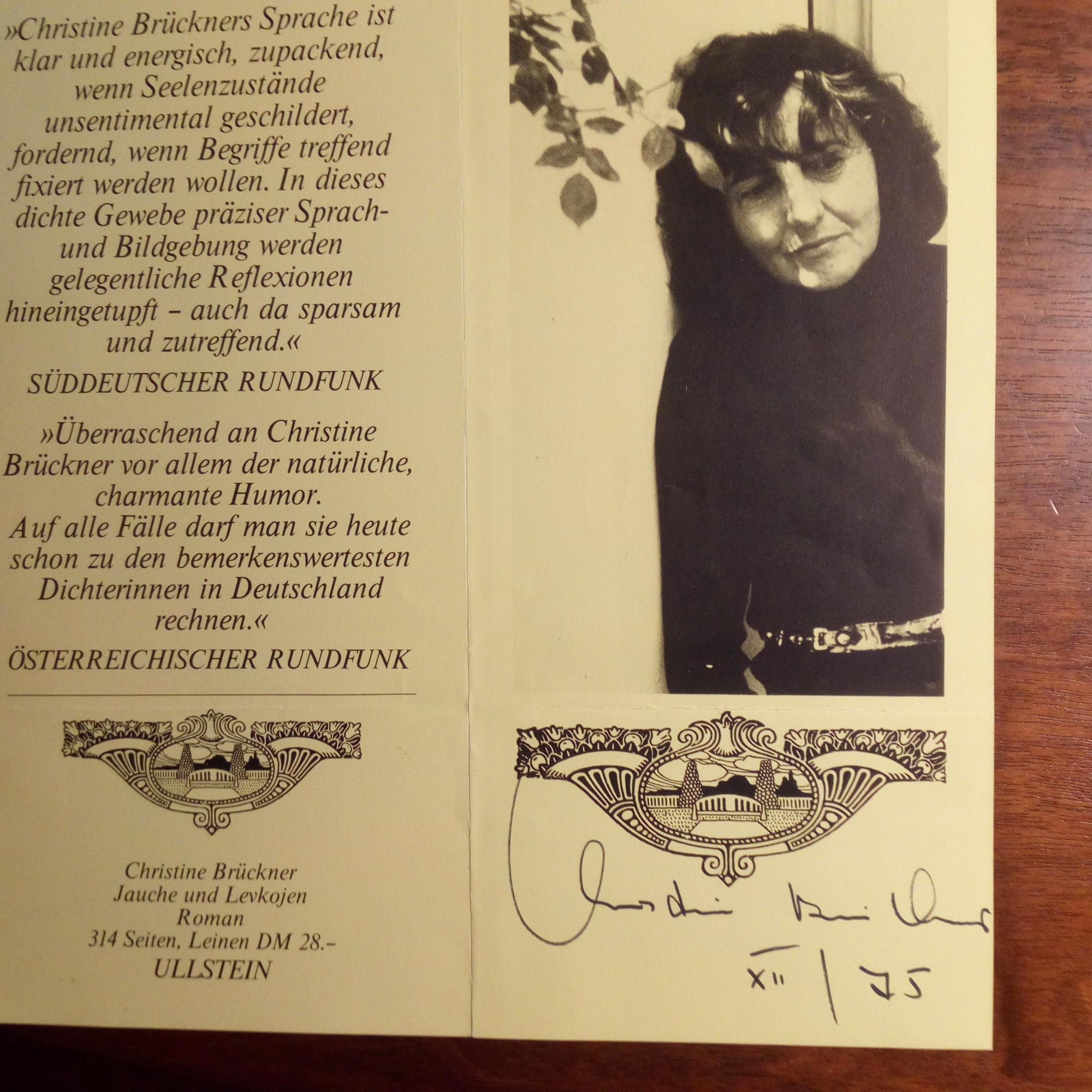 1921-96, Schriftstellerin - Karte mit mont. kl.Druck-Pfo., U. und Jahr 1972. Beiliegt Buch-Faltprospekt mit Pfo. und e. Zeilen, U. und D. 8.1.1987. "Tut mir leid! Ich schreibe nichts mit der Hand...".