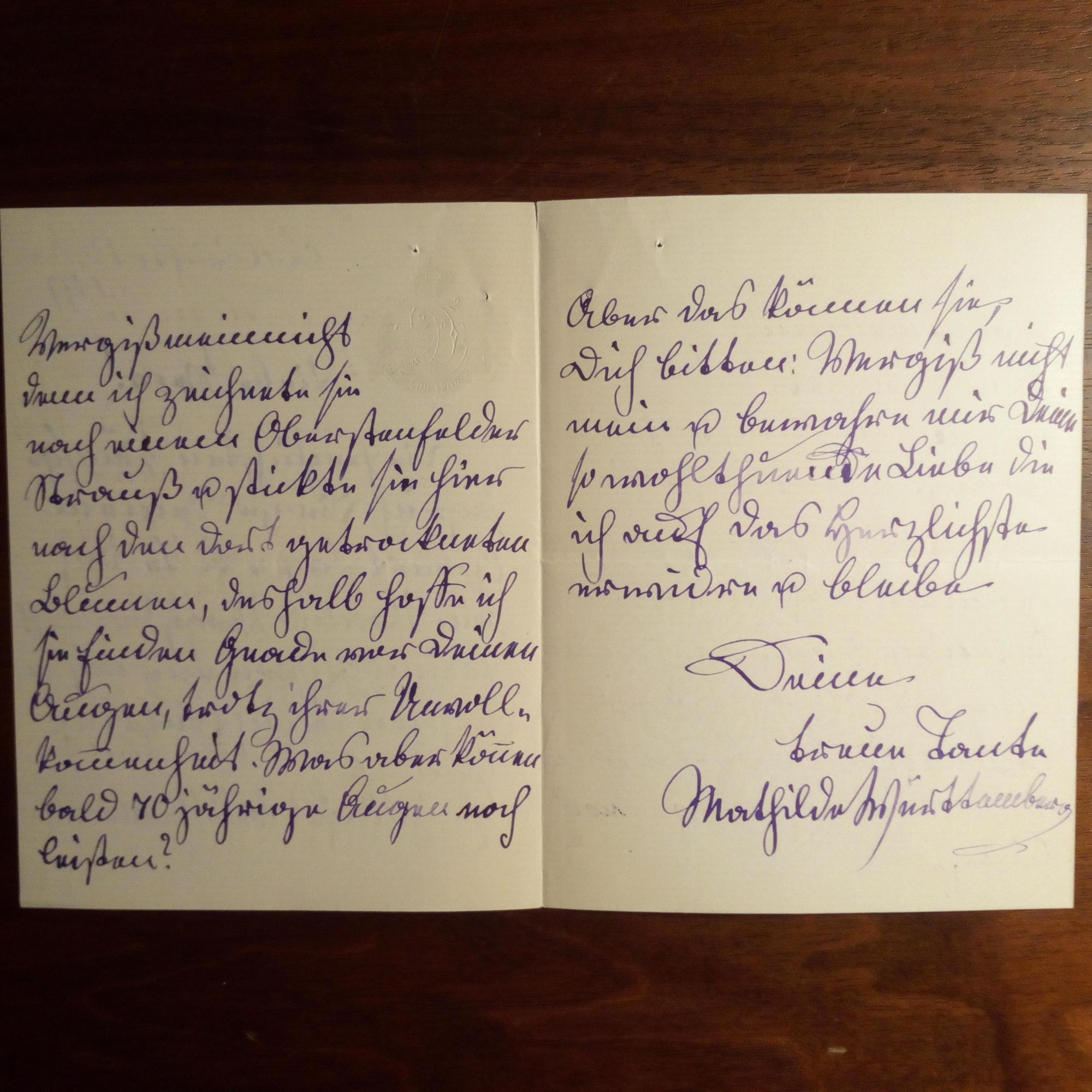1829-1913, Herzogin (Tochter von Eugen von W.), Äbtissin von Oberstenfeld - E. Brief mit U., Karlsruhe 19.4.1897, 3 S. 8°, schwarzer Rand. An Wera von Württemberg (1854-1912, russ. Großfürstin, verh. mit Herzog Wilhelm Eugen von W.). Gratuliert ausführl. zur Hochzeit von Tochter Elsa. ...sende ich Dir eine Kiste mit einem Silberteller mit Ansicht von Carlsruhe... Beiliegt e. Brief mit U., 13.2. 1899, 3 S. kl. 8°, gedr. Wappen am Kopf, an dies.: Glückwünsche zum Geburtstag und sendet ihr eine Handarbeit: ...Es sind gut Württemberg'sche Vergißmeinnicht, denn ich zeichnete sie nach einem Oberstenfelder Strauß und stickte sie hier nach den dort getrockneten Blumen...