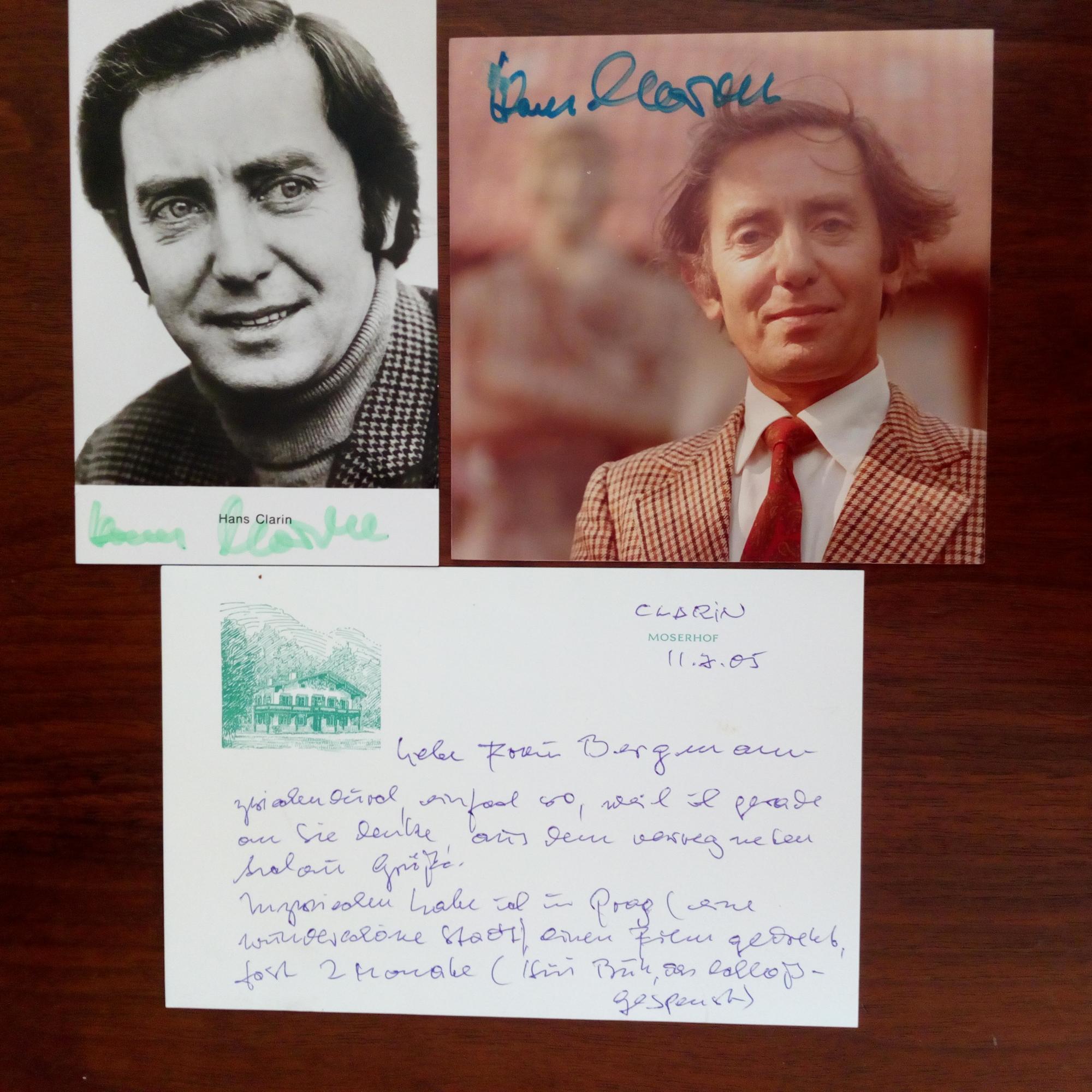 1929-2005, Schauspieler und Sprecher - E. Briefkarte mit U. und D. 11.7.2005 (ca. 1 Monat vor s. Tod), Briefkopf Moserhof (sein Anwesen im Chiemgau, mit kl. Ansicht davon), 2 S. An die Psychologin Dietmut Bergmann in Lübeck: ...einfach so, weil ich an Sie denke...Inzwischen habe ich in Prag...einen Film gedreht...(Hui Buh, das Schloßgespenst)... mit e. postal. Umschlag. Beiliegen 2 Pfo., je mit U.