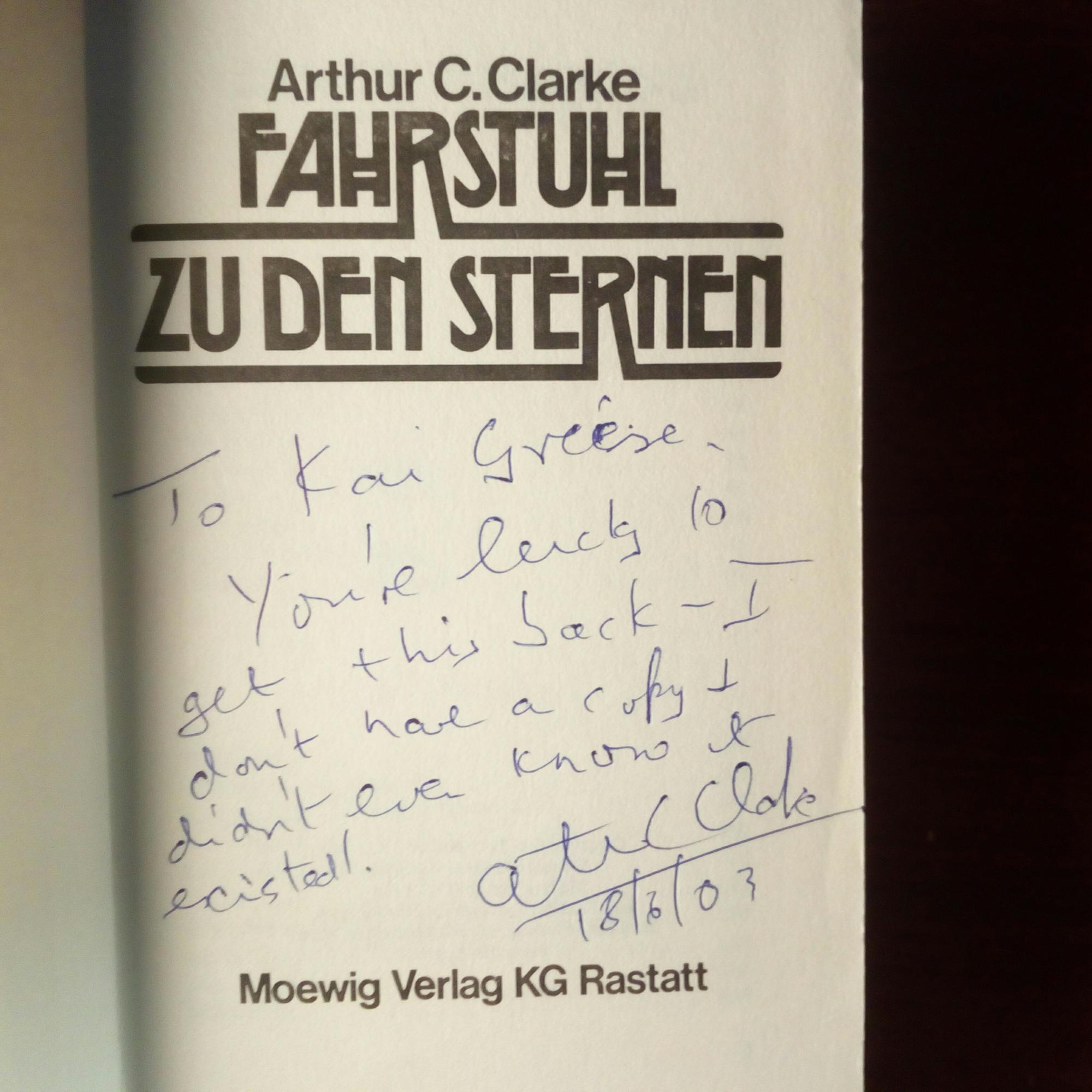 1917-2008, brit. Science-Fiction-Autor - E. Widm. (für den Antiquar Kai Griese), e. Anmerkung ("You're lucky to get it back - I don't have a copy + didn't even know it existed!"), U. und D. 18.6.2003, auf Titel seines "Fahrstuhl zu den Sternen", Moewig-Verl. 2003, verl.frisch.