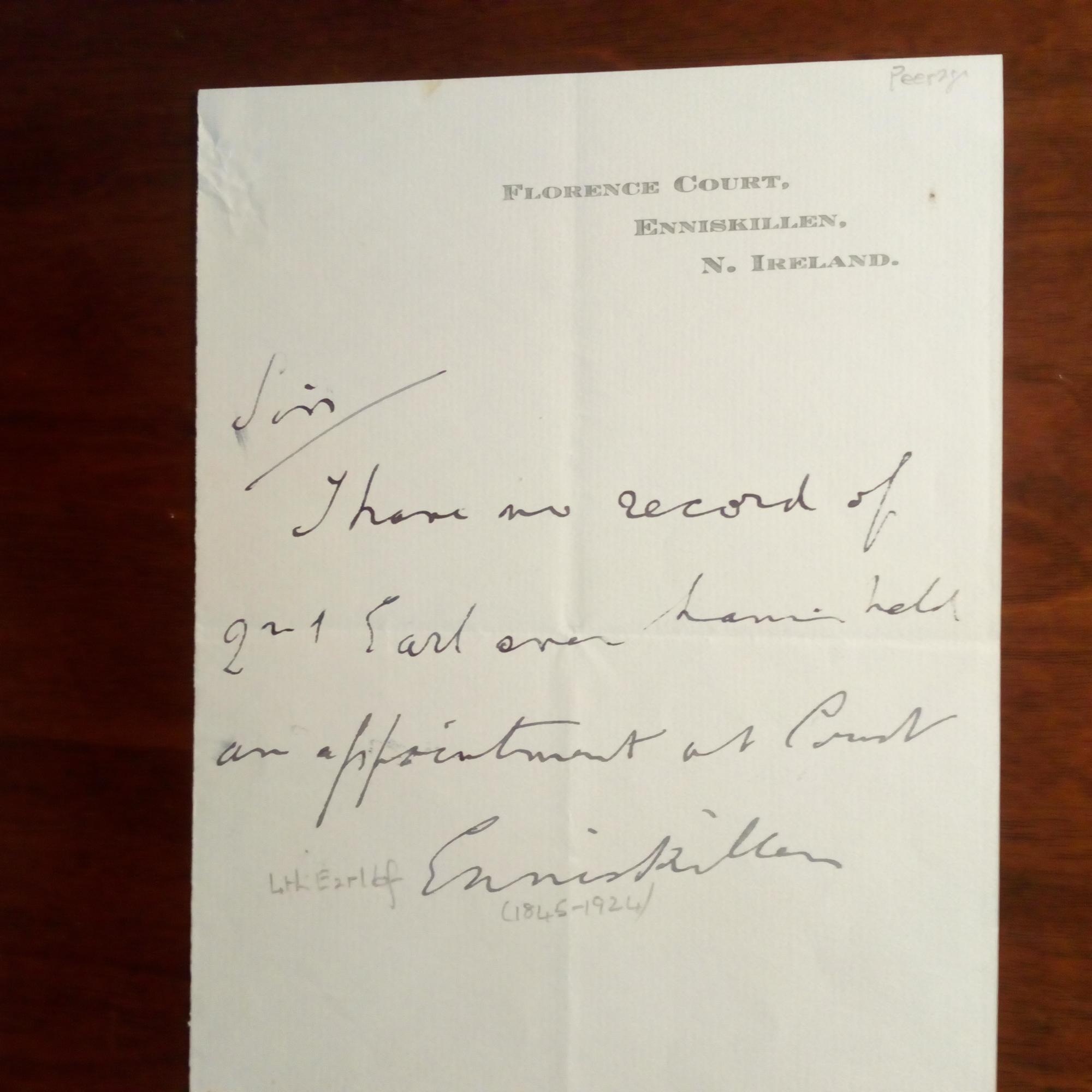 4th Earl of Enniskillen, 1845-1924, nordir. Politiker - E. Billett m. U., ¾ S. 8°, Br.kopf. Bittet um eine Auskunft.