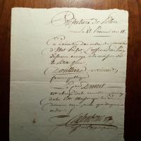 geb. 1751, "Secrétaire-greffier de la Commune de Paris" - Amtl. Schreiben mit U., Préfecture de Police, "Le 12. Prairial an II" (31.5.1794). An den frz. General Drouet (wohl Jean-Baptiste, 1765-1844): Auf Befehl des "Conseiller d'Etat Préfet" wird er verpflichtet, die "femme publique" Antoinette Dovilliers in der "Petite force" (Pariser Frauengefängnis) abzuholen und wieder bei sich aufzunehmen.