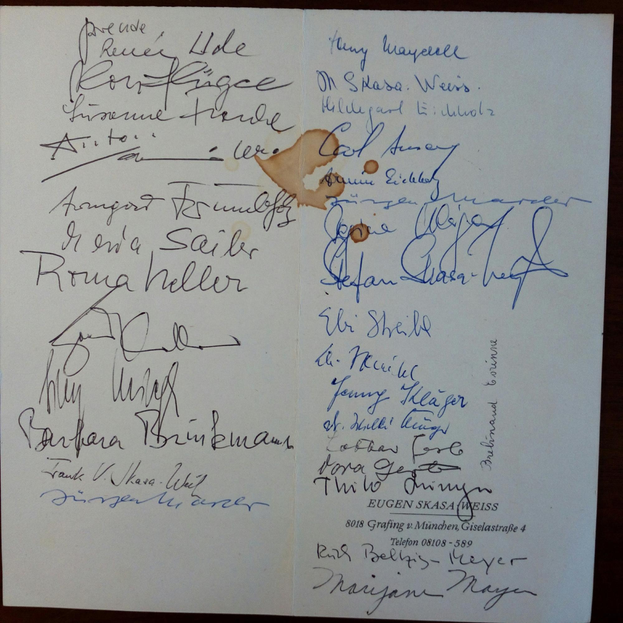 Liste m. 31 U. auf einer Klappkarte m. gedr. Adr. des Schriftstellers Eugen Skasa-Weiss (1905-77) in Grafing (b. München). Dabei: Carl Amery, Armin Eichholz, Jürgen Marder, Jenny Kläger, Ron Flügel, Barbara Brinkmann, Maria Sailer, Marijane Mayen..., Kaffeefleck.