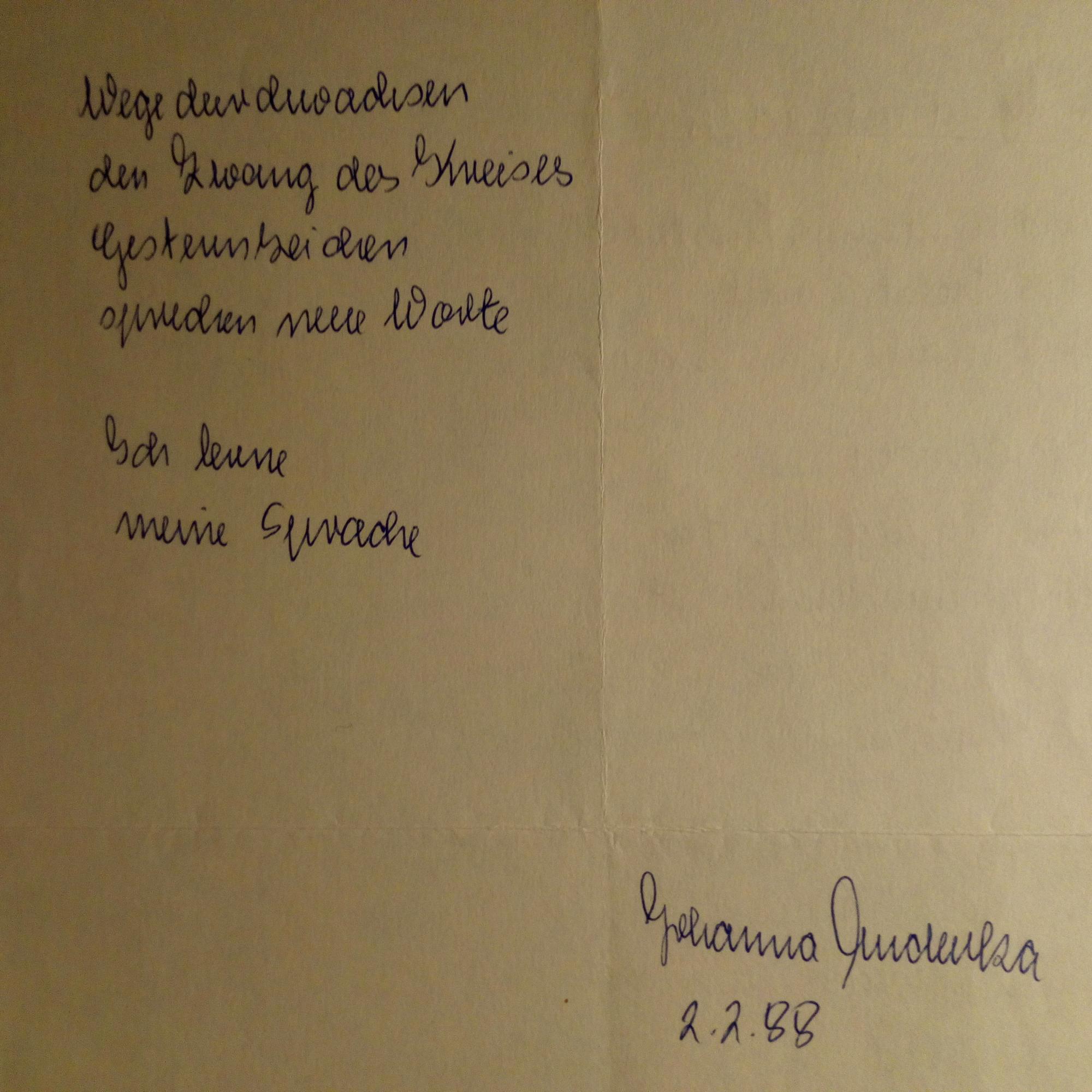 1933-2022, Schriftstellerin - E. Gedicht (6 Z.), U. und D. (Ulm) 2.2.1988. Mit Begleitbr. mit e. Grüßen und U. Dazu ihr Gedicht-Heft "Für L." (1986) mit U. auf Titel. Mit postal. Umschlag.