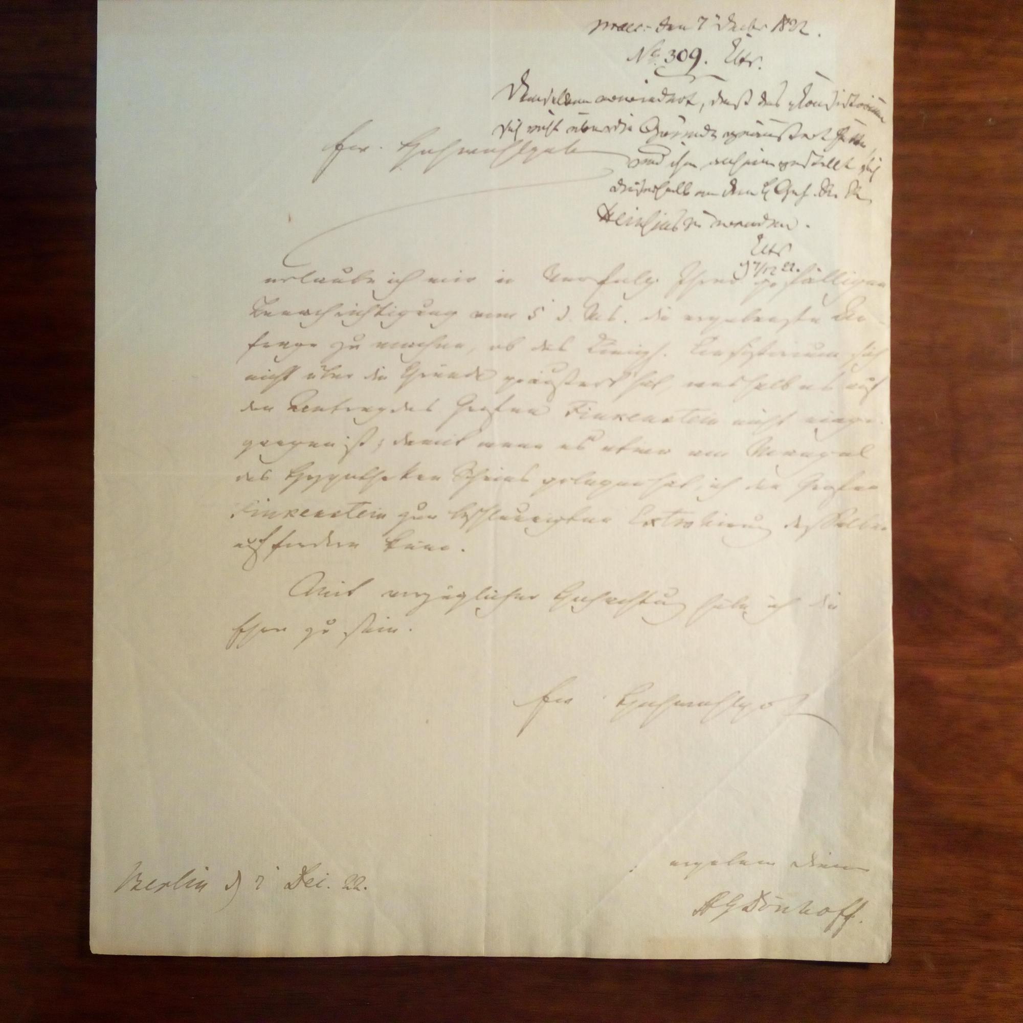 1797-1874, preuß. Staatsmann, später Außenminister - E. Brief mit U., Berlin 7.12.1822. An Hauptm. Eltester: Will wissen, "weshalb das Königl. Consistorium nicht auf einen Antrag des Grafen Finkenstein eingegangen sei, damit wenn es etwa am Mangel des Hypotheken Scheins gelegen hat, ich...zur beschleunigte Extrahierung desselben auffordern kann...". Rechts oben Bearb.notizen des Empfängers mit 2 x U.: Er möge sich an Regierungsrat Heinlius wenden. Transkription liegt bei.