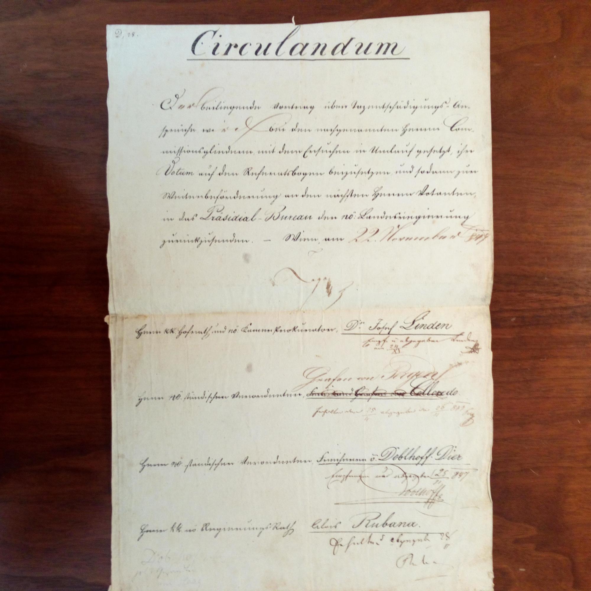 1800-72, österr. Politiker - "Circulandum" (1 S. folio) des Präsidial-Büros der niederösterr. Landesregierung betr. Verhandlungen über Entschädigungs-Ansprüche, Wien 22.11.1848. Darauf e. Bearb.vermerke mit U. von den Kommissions-Mitgliedern Josef Linden, Graf von Pergen, ihm und Alois Rubana.