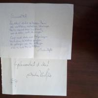 1890-1981, Schriftsteller - E. Gedicht ("Einsiedel", 2 Str. à 4 Z.) mit U., 1 S. 8° quer. Beiliegt 8°quer-Blatt mit e. "Gelassenheit ist alles!", U. und D. 25.11.1957.