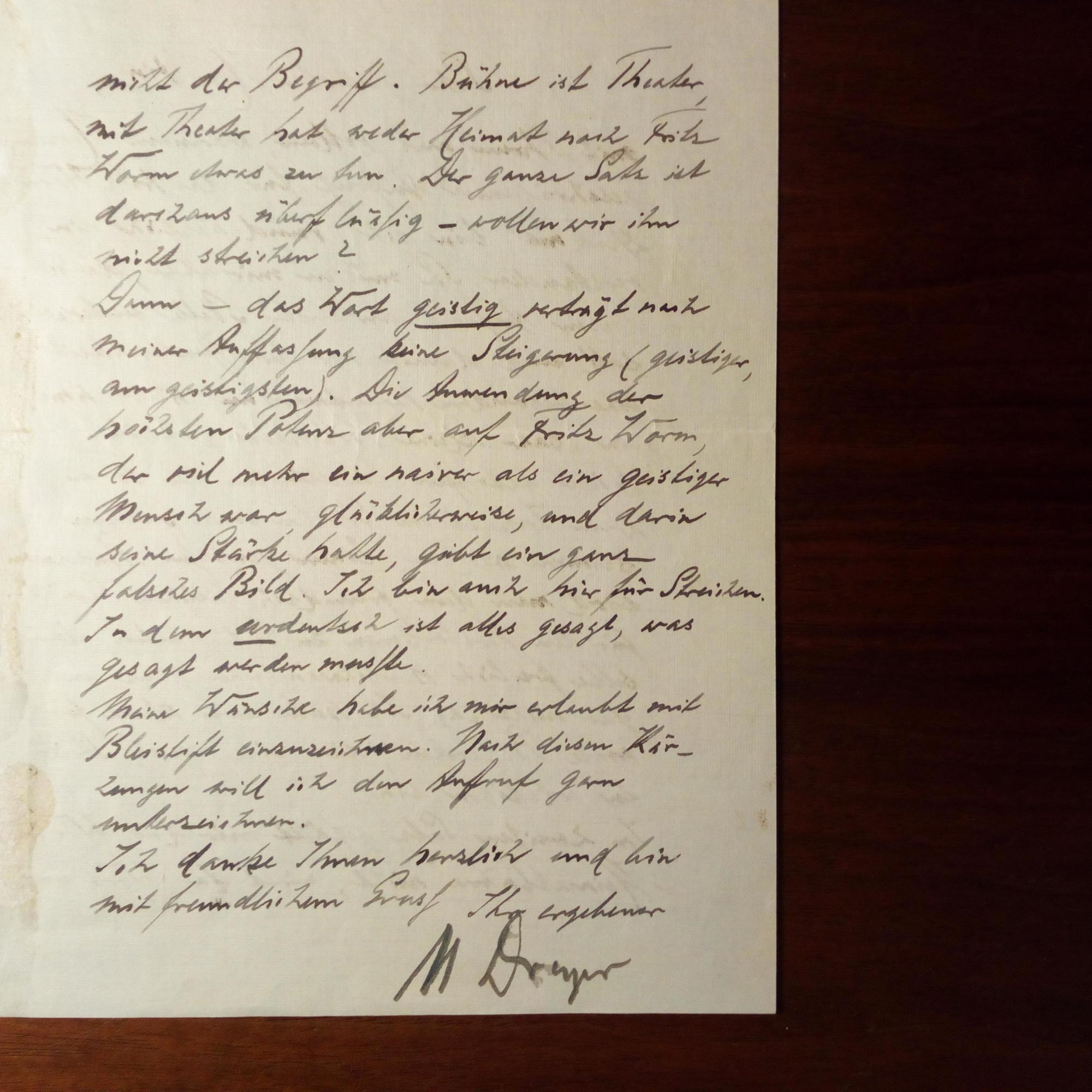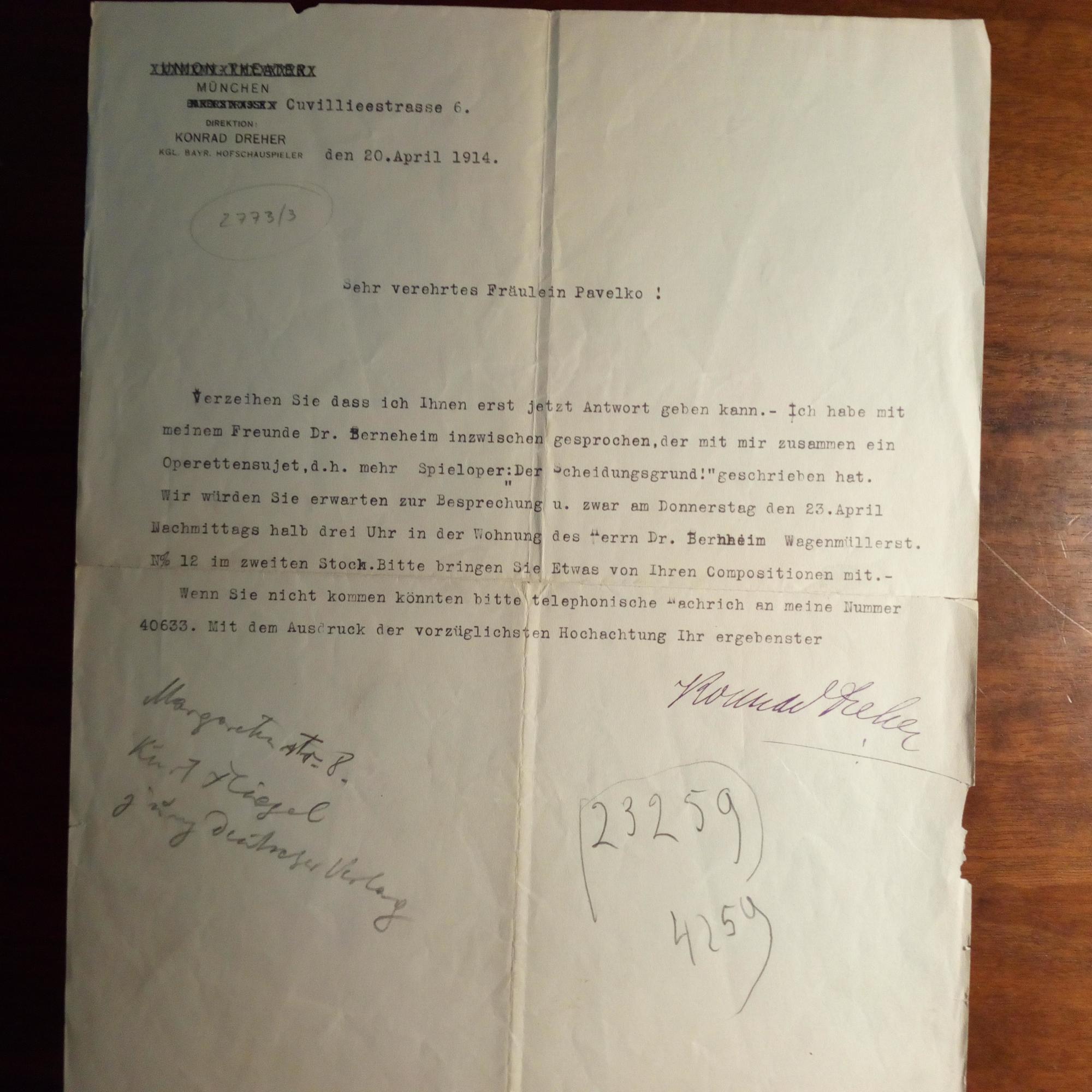 1855-1944, Schauspieler und Sänger - 3 Briefe mit U., (München) 29.3.-22.4.1914, je ca. ½ S. 4°, Briefkopf als Direktor des "Union-Theaters" (Name ausgestrichen) in München, Gebr.spuren. An die Sängerin Jolanta Pavelko in Mü.: ...habe mit meinem Freunde Dr. (Benedikt) Bernheim inzwischen gesprochen, der mit mir...die Spieloper "Der Scheidungsgrund" geschrieben hat...Bitte bringen Sie Etwas von Ihren Compositionen mit...