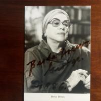 1923-86, Schriftstellerin - E. Widm., Zitat (4 Z. aus "Gestern war heute") und U. unter auf 4° mont. privatem Hochglanz-Pfo. Dazu Begleitbrief mit U., (Berlin) 26.11.1978, ½ S. 4°, Br.kopf.