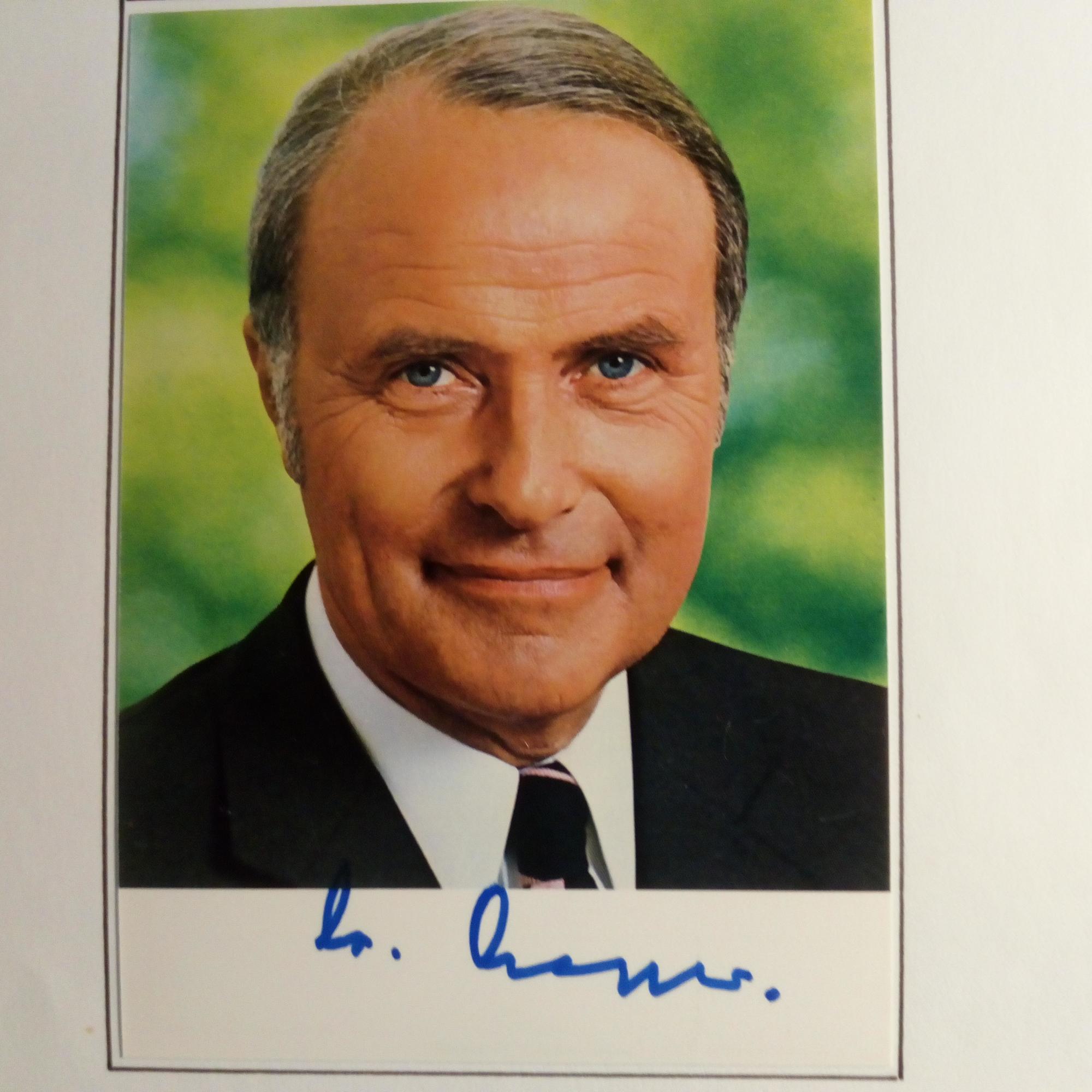 1920-2002, CDU-Politiker - Farb-Pfo. m. U., mont. Beiliegt Seite eines e. Rede-Manuskripts (4°).