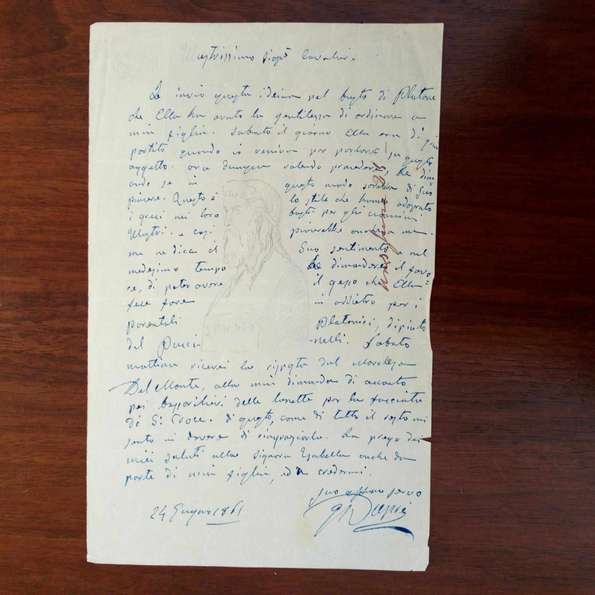1817-82, italien. Bildhauer - E. Brief mit U., 24.1.1861, 1 S. 8°, in der Mitte e. kl. Bleistift-Skizze einer Büste, Aktenvermerk, Altersspuren. An Cavalieri: Über seine Arbeiten, u.a. die noch im gleichen Jahr beendeten "lunette" in Santa Croce in Florenz.