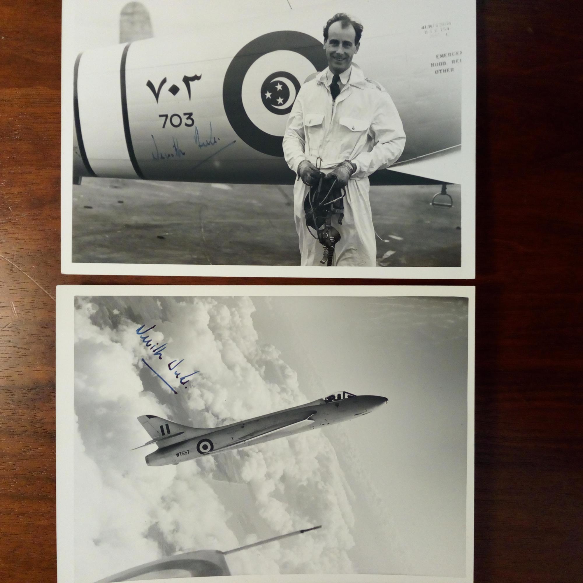 1922-2007, brit. Jagdflieger und Testpilot - 2 Fotos (beim Flug und vor dem Flugzeug, anlässl. seines ersten Testfluges 1951), je mit U. Mit postal. Umschlag (22.11.1960).