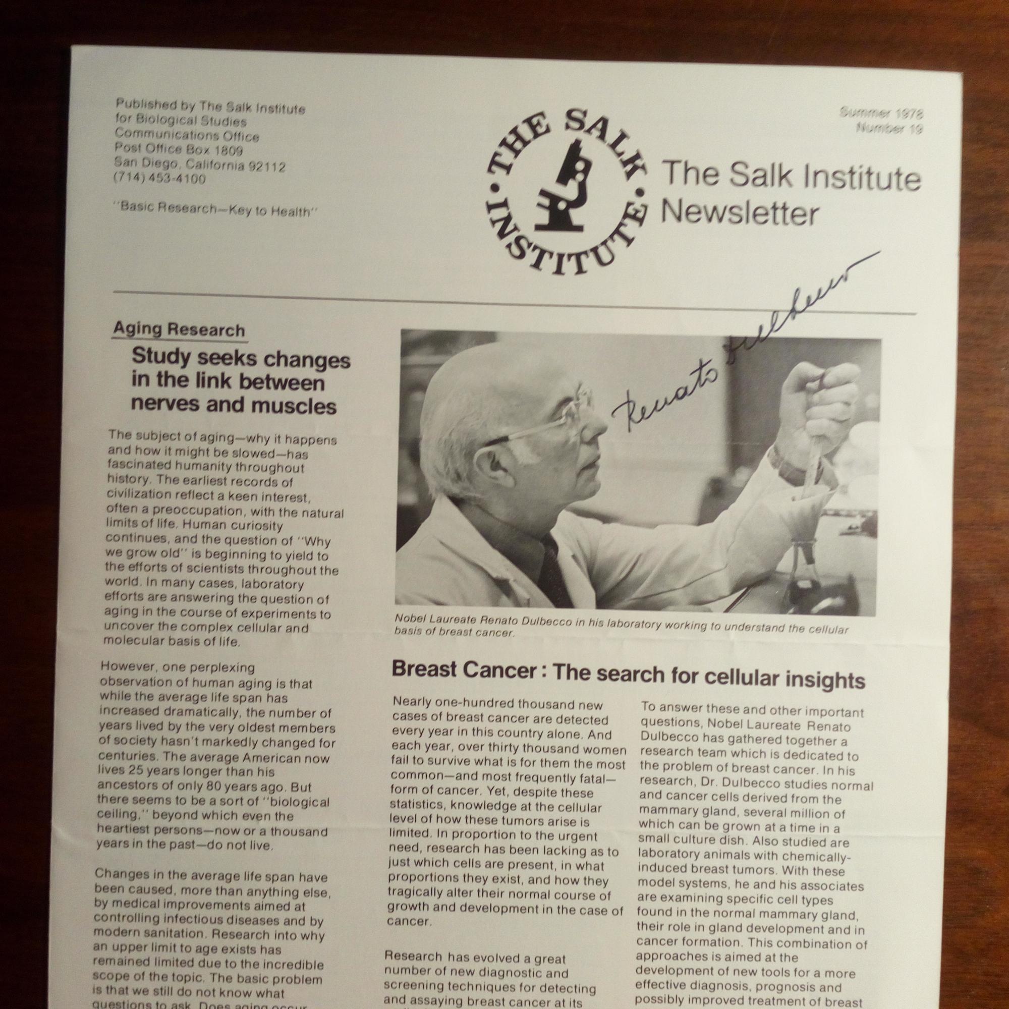 1914-2012, US-Biologe - 2 Sonderdrucke seines Aufsatzes "Breast Cancer: The search for new cellular insights" (erste und überarb. Fassung), Hrsg. vom "Salk Inst." in San Diego 1978, je m. U.