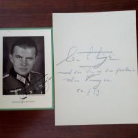 1898-1981, Schriftsteller - 8 Autographen: 1. Kl. 4°-Blatt mit e. Zitat, U. und D. 18.11.1930. "Was wir litten, haben wir für eine Idee ertragen!". 2. Blatt aus dems. Album mit U. und D. "nach den Tagen des polnischen Krieges" 20.10.1939 (Kopierstift). 3. Pfo. (in Wehrmachts-Uniform) mit U., mont. 4. 2 Kärtchen mit U., eines mit D. 10.11.1951. 5. Brief mit U., (Briefkopf Seeg, Allgäu) 19.5.1953. Bittet, "mit meinem kleinen Beitrag zufrieden zu sein...". 6. Brief mit U., (Seeg 24.9.1970), ¾ S. 4°, gel. An die "Arbeitsgemeinschaft für Werbung": Will gerne zur Urkundenverleihung kommen u.a. 7. Karte mit e. Gruß, U. und Jahr 1975.