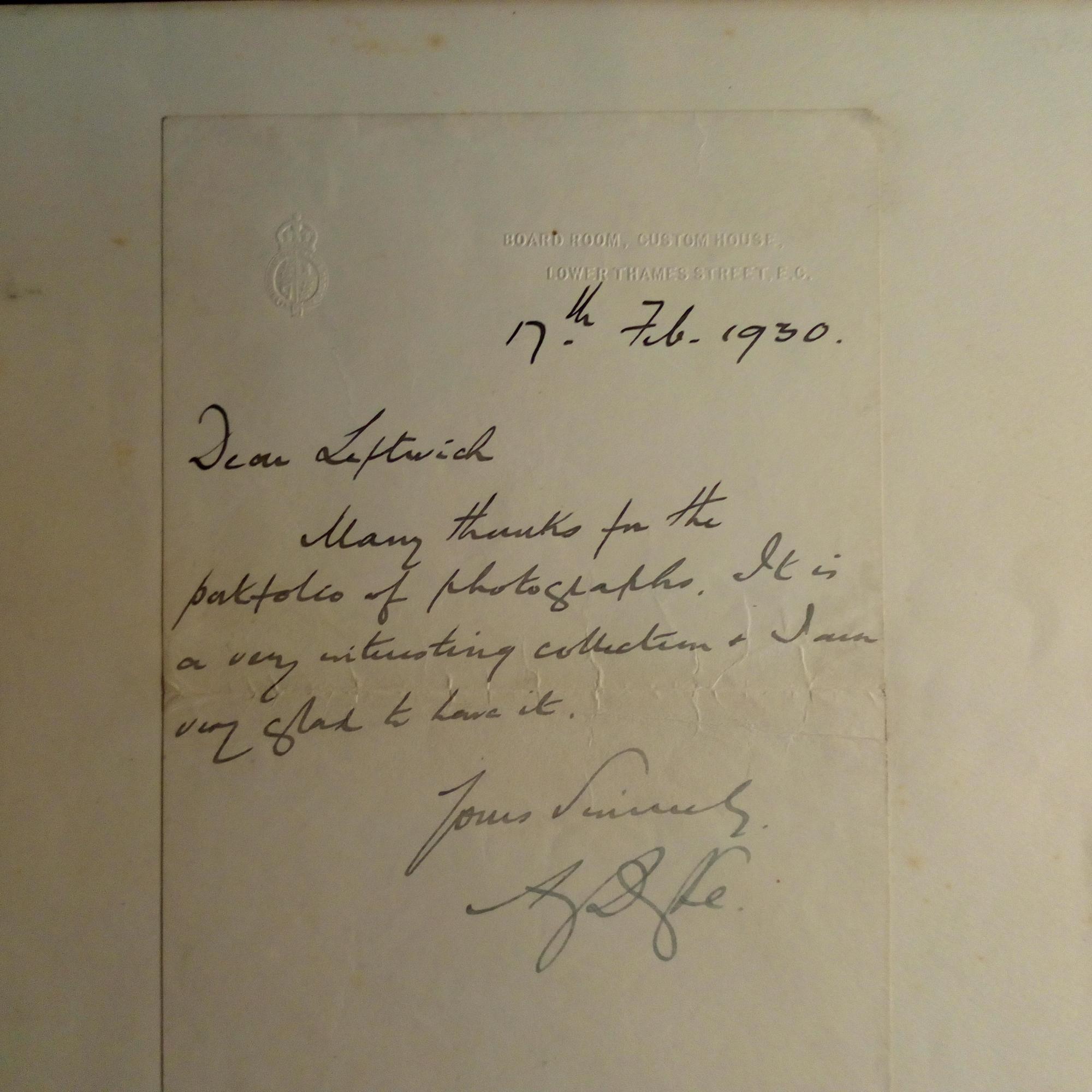 1872-1933, brit. Staatsmann - E. Br. m. U., (London) 17.2.1930, ¾ S. 8°, Gebr.spuren, mont. auf 4°. Bedankt sich bei Loftwich für Fotos: ...a very interesting collection...