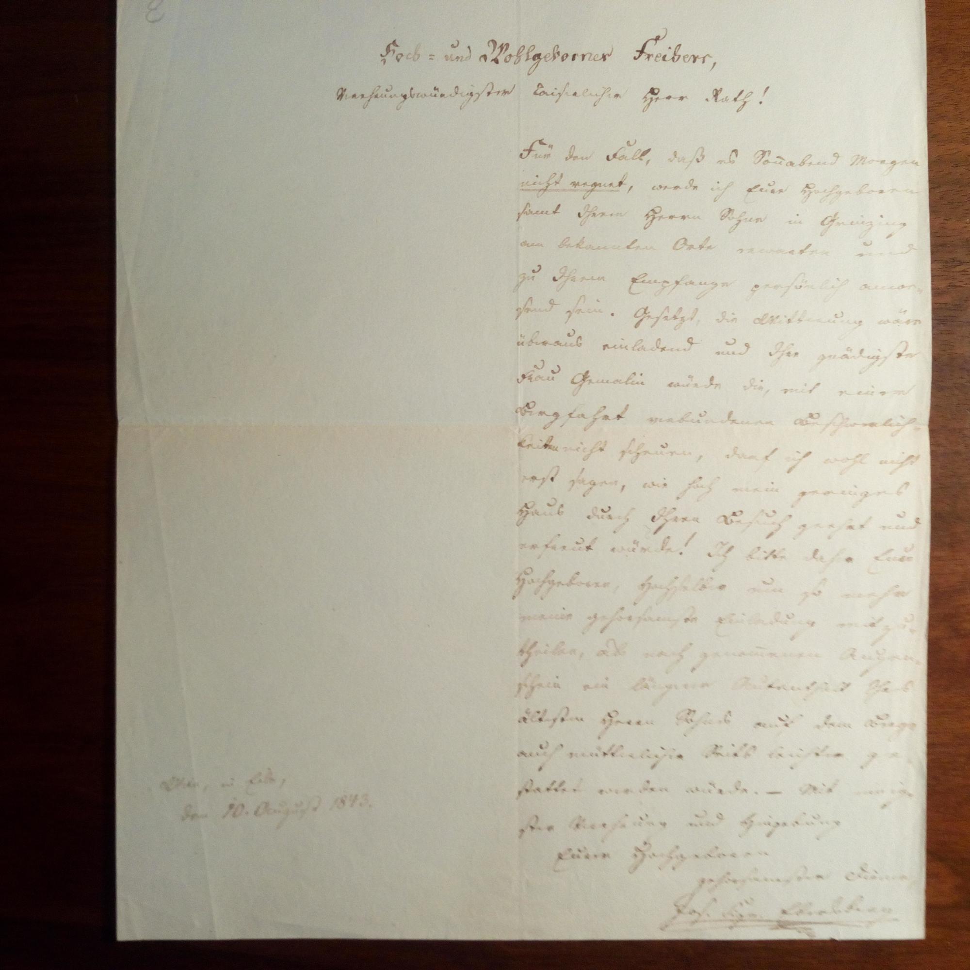 1799-1854, österr. Schriftsteller und Volkspädagoge - Schöner e. Br. m. U., Wien 10.8.1843, 1 S. folio. "in Eile" an einen "Kaiserlichen Herrn Rath" ...Für den Fall, daß es Sonnabend Morgen nicht regnet, werde ich Euer Hochgeboren samt Ihrem Herrn Sohn in Grinzing an bekannter Stelle erwarten... und lädt ihn zu sich ein.