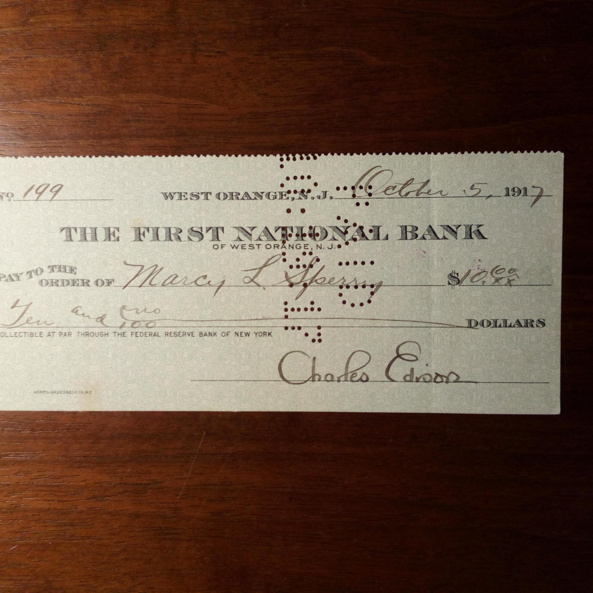 1890-1969, US-Politiker, Sohn von Thomas Alva E. - Scheck der "First National Bank" vom 5.10.1917 über 10 $ mit U., loch-entwertet. Auf Rücks. e. Z. mit U. von and. Hand: "pay to order of...".