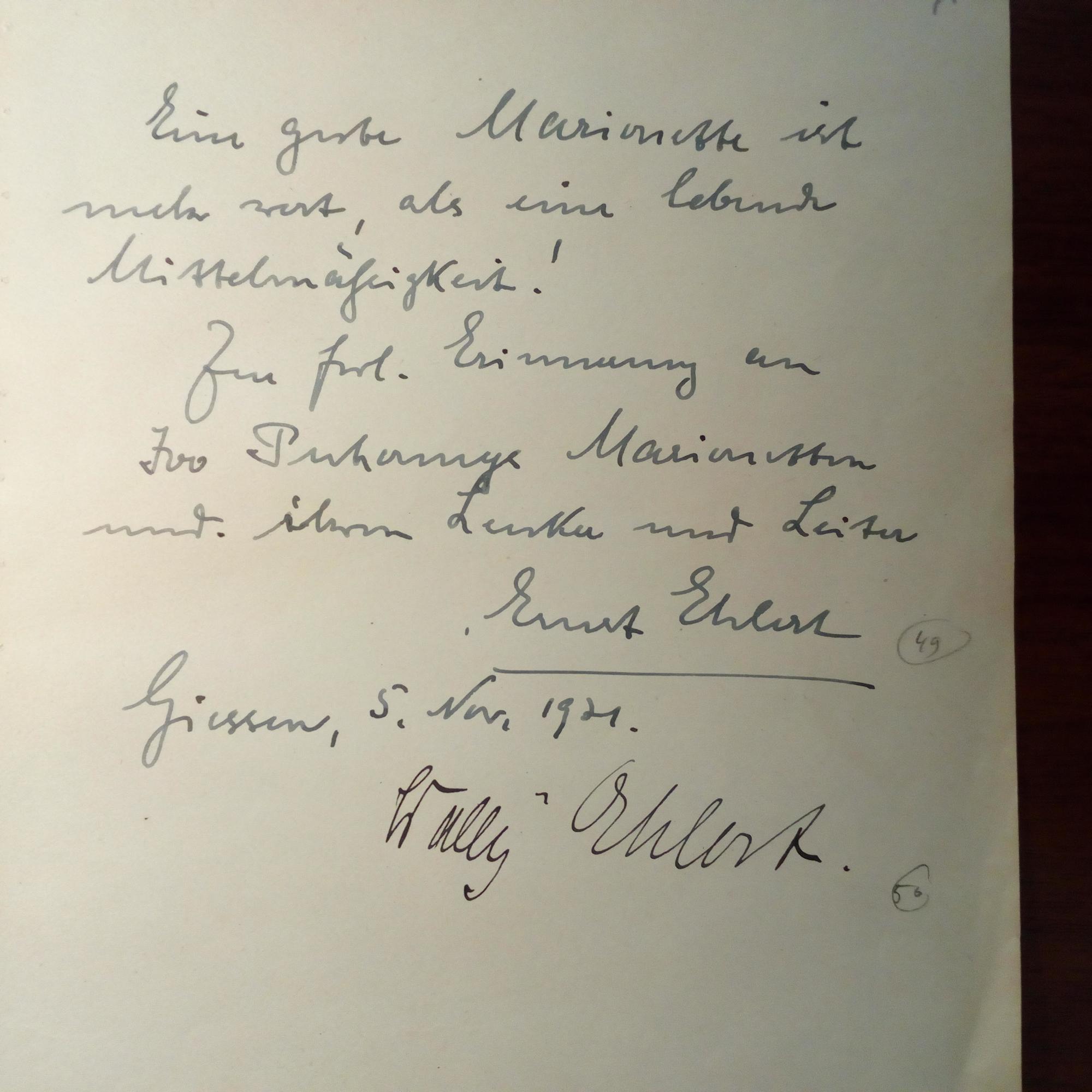 1881-1965, Direktor d. "Ivo Puhonny-Künstler-Marionettentheaters" in Baden-Baden - 4°-Blatt mit e. Zitat und U., Gießen 5.11. 1921. Weitere U. von seiner Gattin und Mitarbeiterin Wally E.