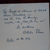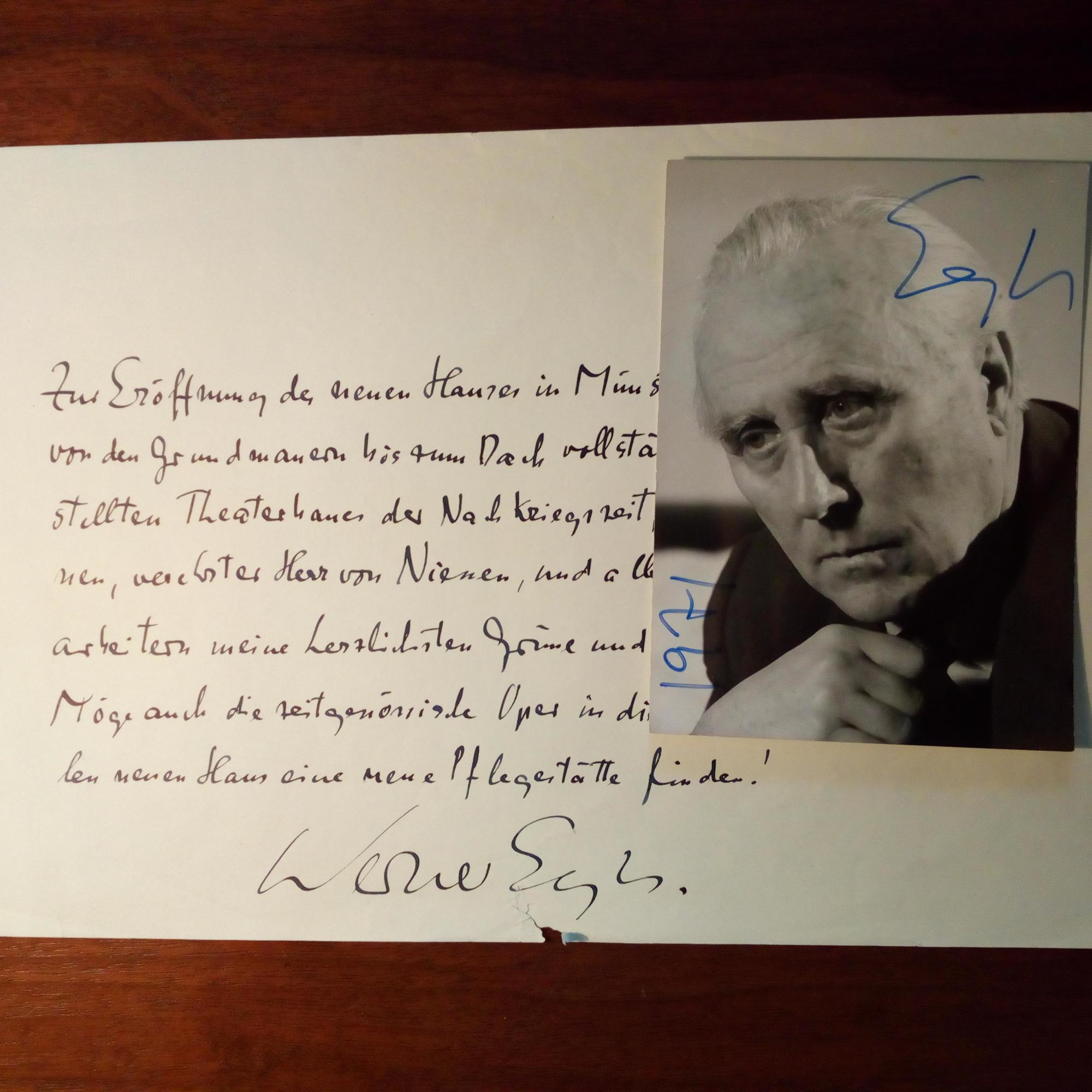 1901-83, Komponist - E. Zeilen und U., 1 S. 4° quer, kl. Randschaden. Glückw. z. Eröffnung des Theaters in Münster am 4.2.1956 für den Intendanten Bruno von Niessen (1902-81). Beiliegen 2 Pfo. (eines mit Jahr 1971) mit U., Blatt aus Programmheft mit Pfo. und U., und e. Dankesz. und U. unter Brief mit Wünschen z. 75. Geb. (5 Autogr.).