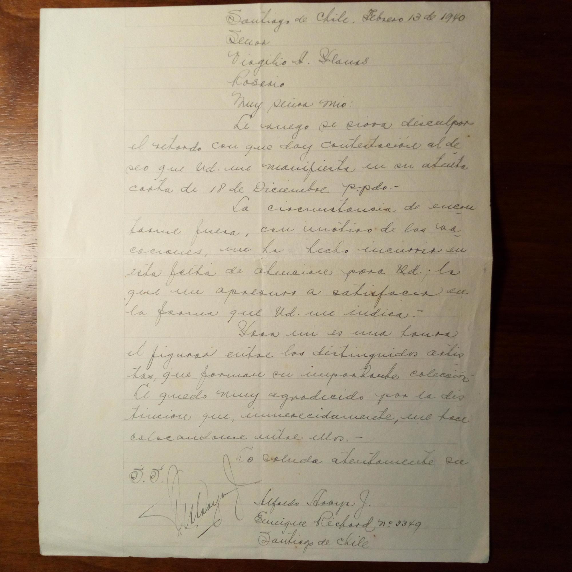 1893-1954, chilen. Maler - E. Brief mit U., Santiago 13.2.1940, 1 S. 4°. Wohl zum Verkauf von Werken.