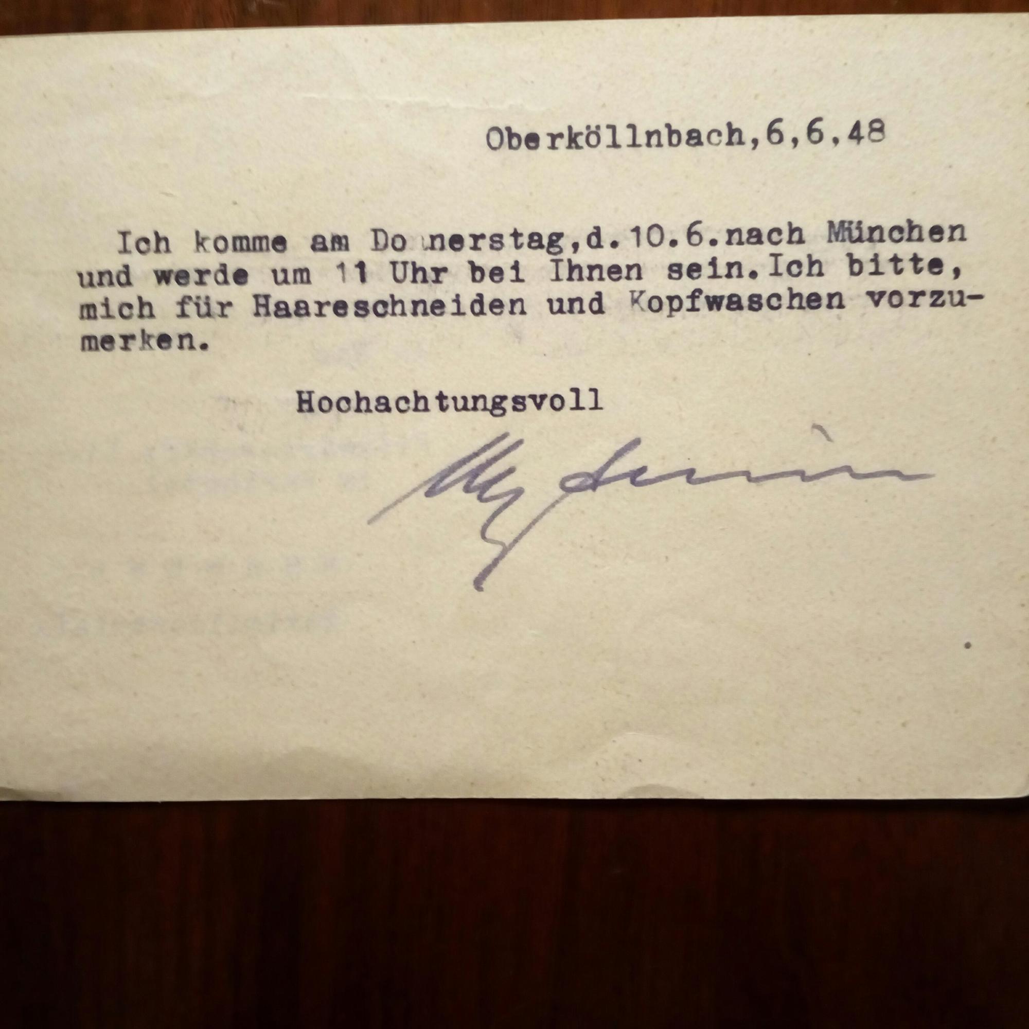 1903-1997, Graf, Schlossherr auf Muskau, Familienhistoriker - Postal. Postkarte mit U. (Tintenstift), Oberköllnbach 6.6.1948. An das Friseurgeschäft Linmayer im Parkhotel, München: ...komme am...10.6. nach München und werde um 11 Uhr bei Ihnen sein...