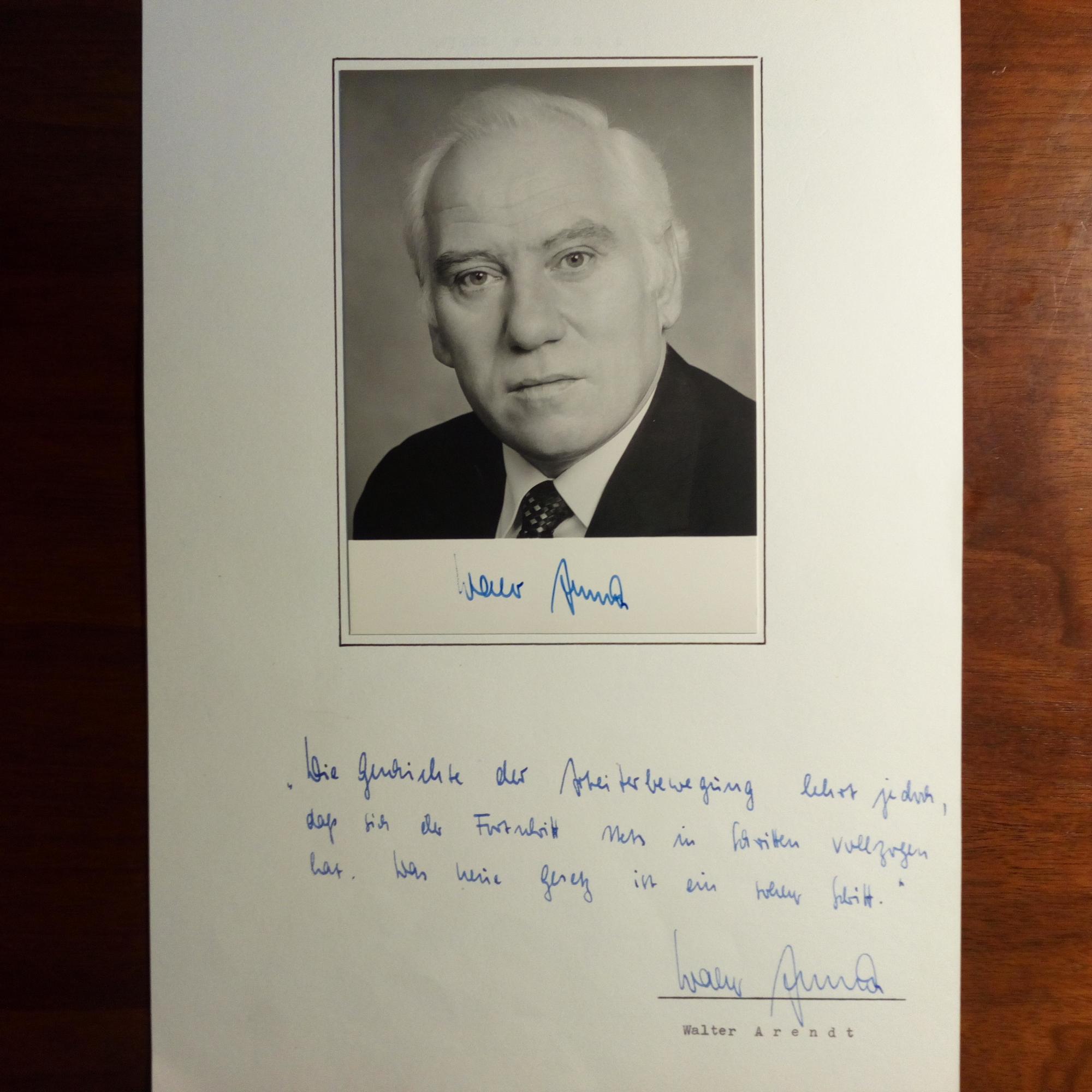 1925-2005, SPD-Politiker, Arbeitsminister - E. Zitat (zu einem neuen Gesetz) m. U. unter auf 4° mont. Pfo. m. U. Beiliegt kl.Broschüre "Deshalb bin ich Sozialdemokrat" m.U.u.D. 11.4.1974 auf Titel (unter Pfo. und SK m.U.