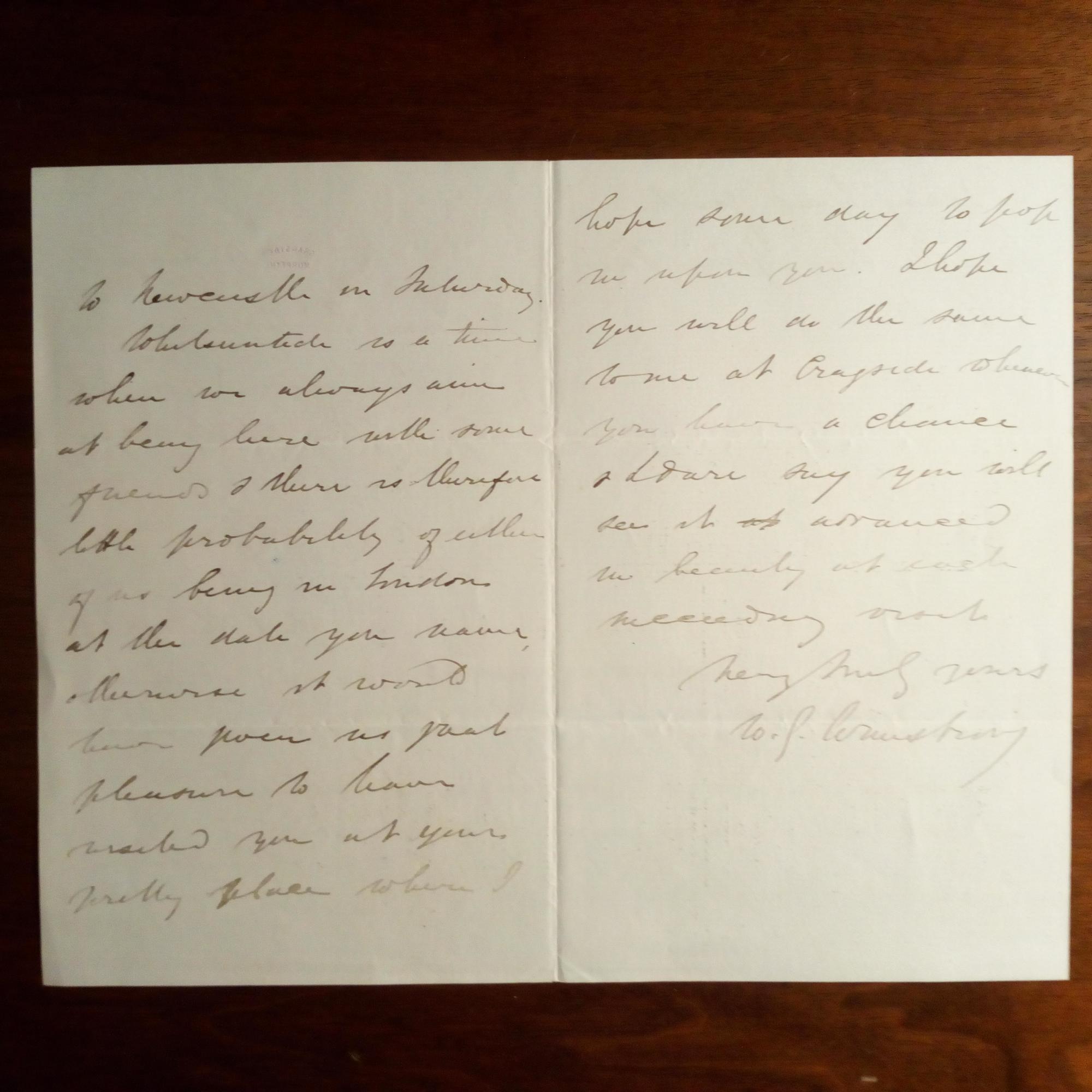 1810-1901, 1. Baron A., brit. Industrieller, sein Haus "Cragside" in Morpeth (Northumberland) war das erste voll elektrifizierte der Welt) - E. Brief mit U., Cragside (Briefkopf) 9.5.1871, ca. 3 S. 8°, kl. Gebr.spuren. Sagt einer Einladung ab.