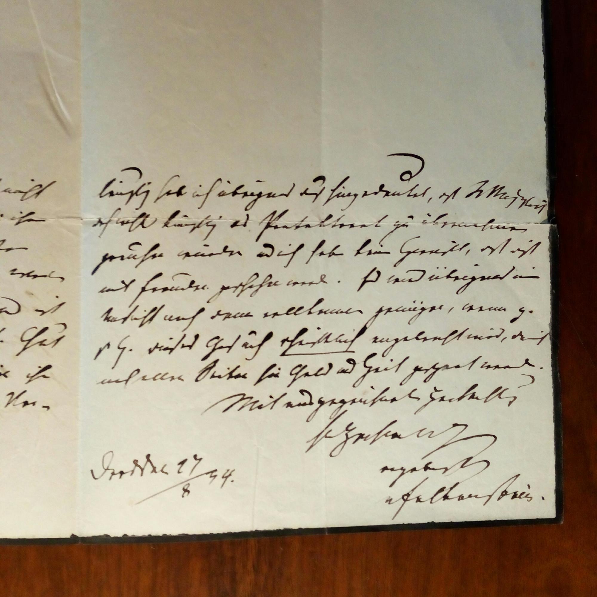 1801-1882, sächs. Staatsmann - 1. E. Brief mit U., lt. Notiz Leipzig Dez. 1822, 1 S. kl. 4°. Dankt einem Freund ausführl. für eine Zuschrift: Da er z. Zt. überlastet sei, müsse er ein Gespräch verschieben. ...Verzeihen Sie mir um Gottes Willen mein Geschmiere... 2. E. Brief mit U., 3 S. 4°, Dresden 27.8.1854, schw. Rand, Gebr.spuren. Der König sei bereit, eine Deputation zu empfangen. Der genaue Zeitpunkt sei nicht festzulegen. Sie sollen in ihrer Unterkunft warten. Um die Sache zu beschleunigen, sollen sie einen schriftlicher Antrag stellen.