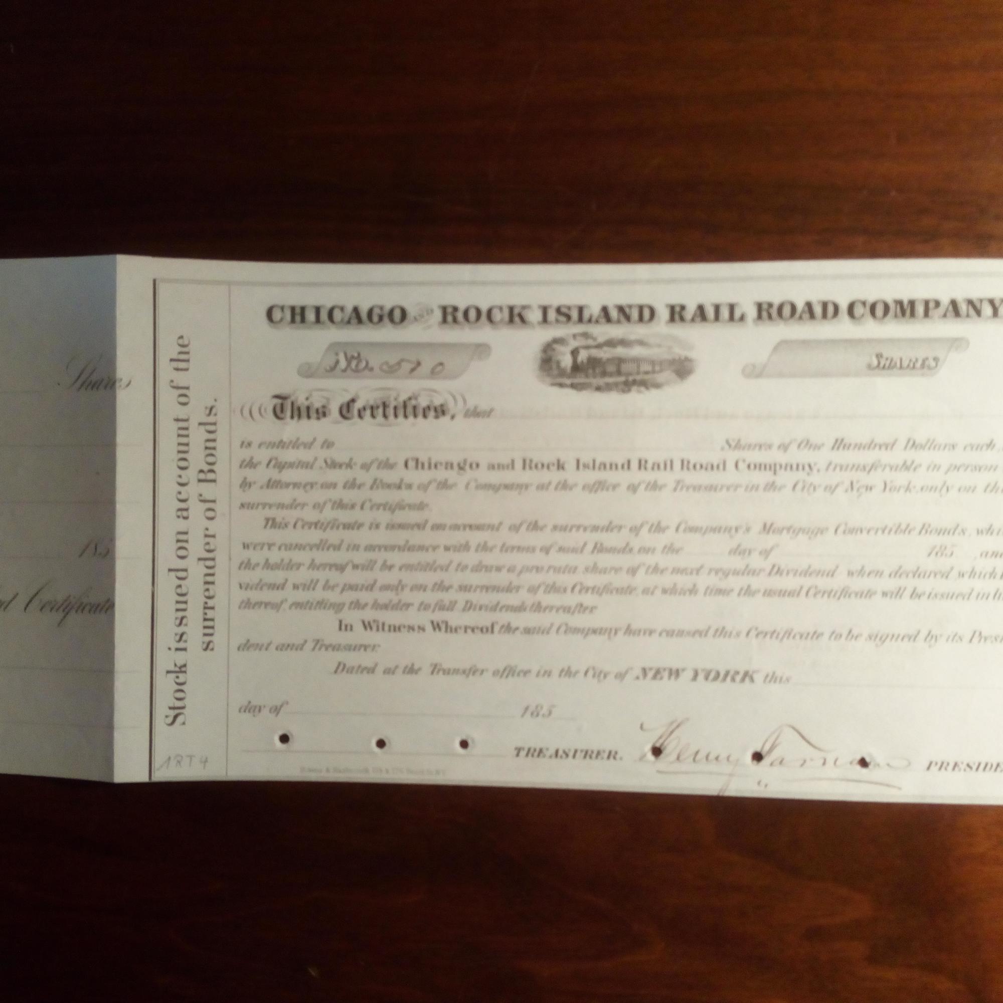 1803-83, US-Ingenieur, Eisenbahn-Unternehmer und Philanthrop - Wertpapier seiner "Chicago and Rock Island Rail Road Co." Nr. 510 (nach 1850), mit U., Loch-entwertet.