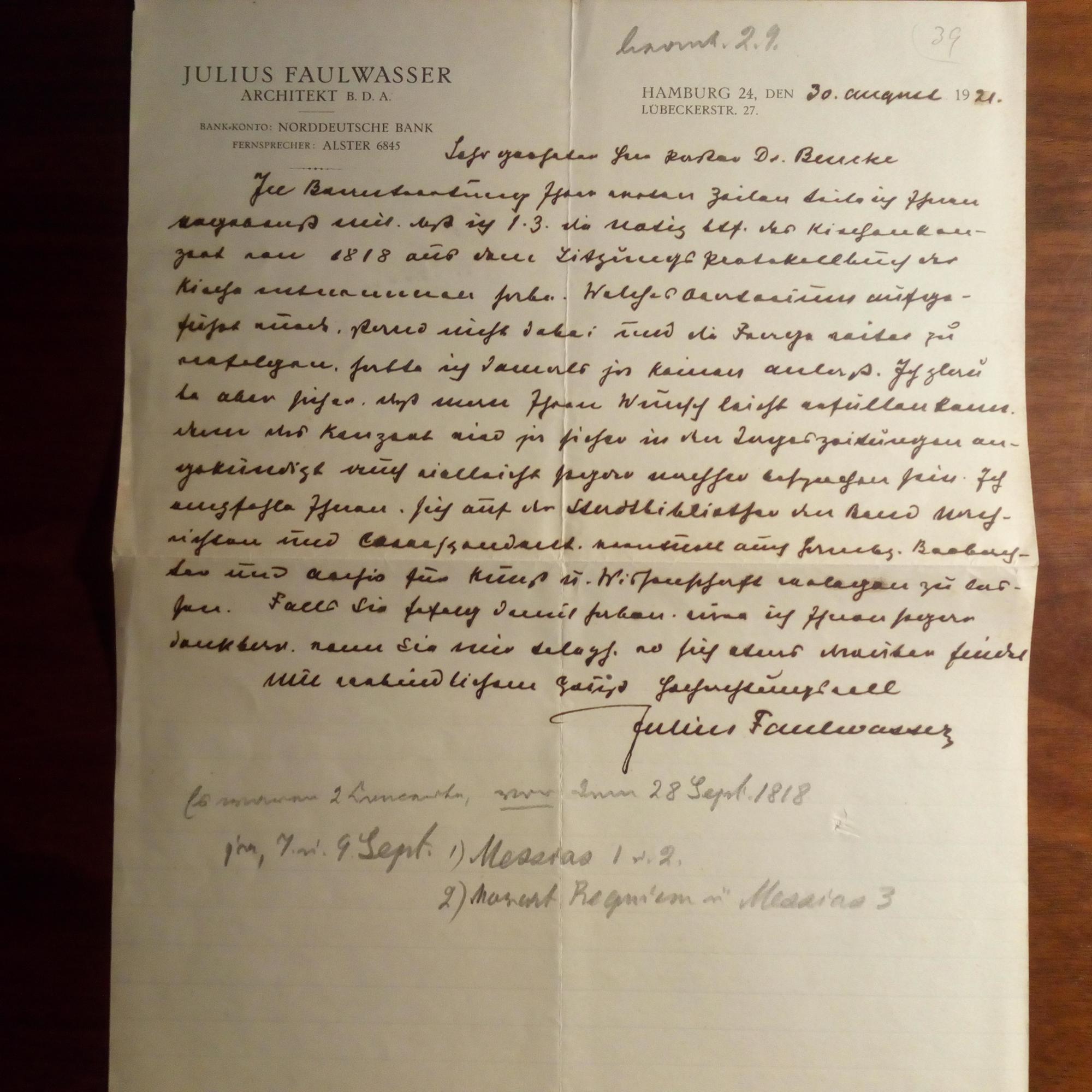 1855-1944, Architekt, Kunsthistoriker - Schöner e. Br. m. U., (Hamburg) 30.8.1921, m. Bearb.notizen des Empfängers, zus. 1 S. 4°, Br.kopf. An Pastor Hugo Friedrich Beneke (1867-1951) in Hamb. m. Details zu Kirchenkonzerten, die dieser besprechen will.