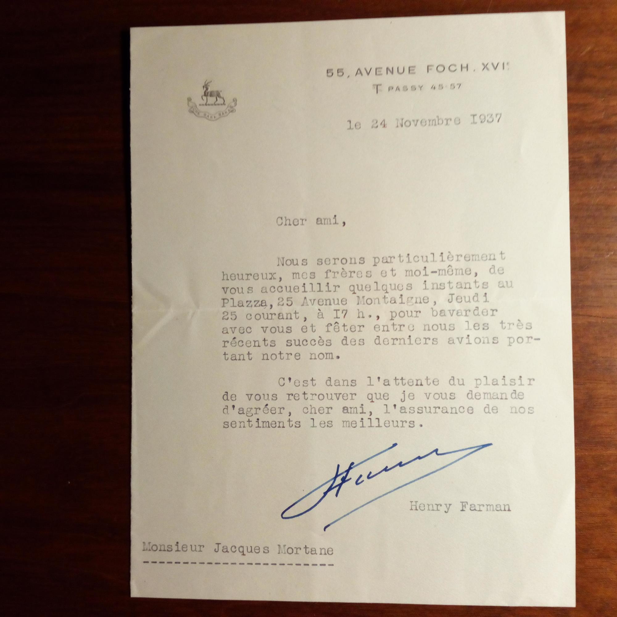 1874-1958, frz. Radsportler, Auto-Rennfahrer, Luftfahrt-Pionier und Unternehmer - Brief mit U., (Paris) 24.11.1937, 1 S. 8°, Briefkopf mit Emblem. Einladung für den Journalisten und Luftfahrt- Historiker Jacques Mortane (1883-1939): ...pour bavarder avec vous et fêter entre nous les très récents succès des derniers avions portant notre nom...