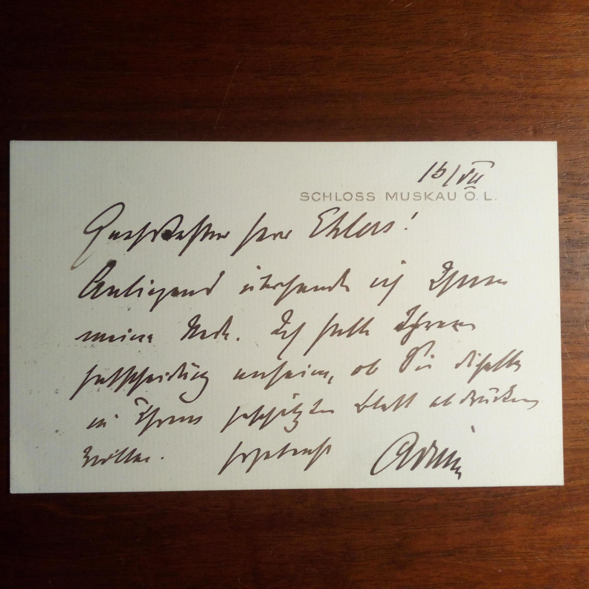 1875-1931, Sport-Funktionär, Förderer der NS-Bewegung - E. Br.karte m. U., 1 S., aufgedr. Ort: "Schloß Muskau O.L.". Wohl 1926 an den Sozialisten Adolf Ehlers (1898-1978), zu dieser Zt. Redakteur bei der "Bremer Arbeiter-Zeitung": Schickt eine Rede: ...ob Sie dieselbe in Ihrem geschätzten Blatt abdrucken wollen...